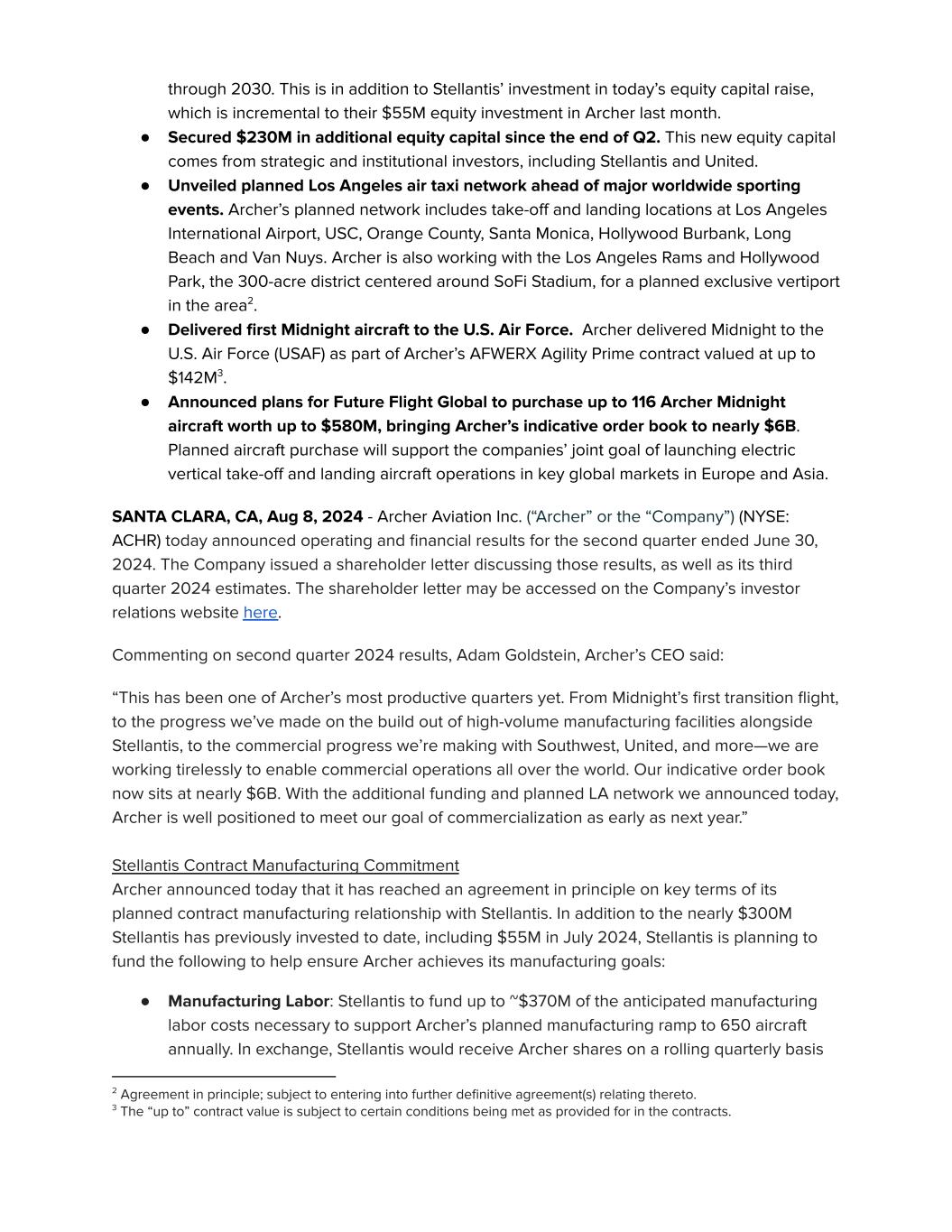 through 2030. This is in addition to Stellantis’ investment in today’s equity capital raise, which is incremental to their $55M equity investment in Archer last month. ● Secured $230M in additional equity capital since the end of Q2. This new equity capital comes from strategic and institutional investors, including Stellantis and United. ● Unveiled planned Los Angeles air taxi network ahead of major worldwide sporting events. Archer’s planned network includes take-off and landing locations at Los Angeles International Airport, USC, Orange County, Santa Monica, Hollywood Burbank, Long Beach and Van Nuys. Archer is also working with the Los Angeles Rams and Hollywood Park, the 300-acre district centered around SoFi Stadium, for a planned exclusive vertiport in the area2. ● Delivered first Midnight aircraft to the U.S. Air Force. Archer delivered Midnight to the U.S. Air Force (USAF) as part of Archer’s AFWERX Agility Prime contract valued at up to $142M3. ● Announced plans for Future Flight Global to purchase up to 116 Archer Midnight aircraft worth up to $580M, bringing Archer’s indicative order book to nearly $6B. Planned aircraft purchase will support the companies’ joint goal of launching electric vertical take-off and landing aircraft operations in key global markets in Europe and Asia. SANTA CLARA, CA, Aug 8, 2024 - Archer Aviation Inc. (“Archer” or the “Company”) (NYSE: ACHR) today announced operating and financial results for the second quarter ended June 30, 2024. The Company issued a shareholder letter discussing those results, as well as its third quarter 2024 estimates. The shareholder letter may be accessed on the Company’s investor relations website here. Commenting on second quarter 2024 results, Adam Goldstein, Archer’s CEO said: “This has been one of Archer’s most productive quarters yet. From Midnight’s first transition flight, to the progress we’ve made on the build out of high-volume manufacturing facilities alongside Stellantis, to the commercial progress we’re making with Southwest, United, and more—we are working tirelessly to enable commercial operations all over the world. Our indicative order book now sits at nearly $6B. With the additional funding and planned LA network we announced today, Archer is well positioned to meet our goal of commercialization as early as next year.” Stellantis Contract Manufacturing Commitment Archer announced today that it has reached an agreement in principle on key terms of its planned contract manufacturing relationship with Stellantis. In addition to the nearly $300M Stellantis has previously invested to date, including $55M in July 2024, Stellantis is planning to fund the following to help ensure Archer achieves its manufacturing goals: ● Manufacturing Labor: Stellantis to fund up to ~$370M of the anticipated manufacturing labor costs necessary to support Archer’s planned manufacturing ramp to 650 aircraft annually. In exchange, Stellantis would receive Archer shares on a rolling quarterly basis 3 The “up to” contract value is subject to certain conditions being met as provided for in the contracts. 2 Agreement in principle; subject to entering into further definitive agreement(s) relating thereto.