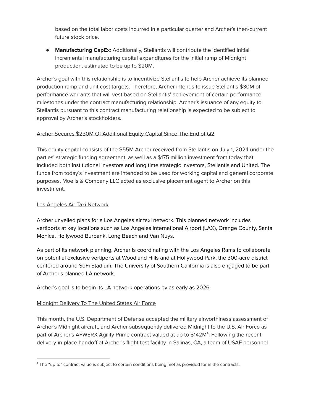 based on the total labor costs incurred in a particular quarter and Archer’s then-current future stock price. ● Manufacturing CapEx: Additionally, Stellantis will contribute the identified initial incremental manufacturing capital expenditures for the initial ramp of Midnight production, estimated to be up to $20M. Archer’s goal with this relationship is to incentivize Stellantis to help Archer achieve its planned production ramp and unit cost targets. Therefore, Archer intends to issue Stellantis $30M of performance warrants that will vest based on Stellantis' achievement of certain performance milestones under the contract manufacturing relationship. Archer’s issuance of any equity to Stellantis pursuant to this contract manufacturing relationship is expected to be subject to approval by Archer’s stockholders. Archer Secures $230M Of Additional Equity Capital Since The End of Q2 This equity capital consists of the $55M Archer received from Stellantis on July 1, 2024 under the parties’ strategic funding agreement, as well as a $175 million investment from today that included both institutional investors and long time strategic investors, Stellantis and United. The funds from today’s investment are intended to be used for working capital and general corporate purposes. Moelis & Company LLC acted as exclusive placement agent to Archer on this investment. Los Angeles Air Taxi Network Archer unveiled plans for a Los Angeles air taxi network. This planned network includes vertiports at key locations such as Los Angeles International Airport (LAX), Orange County, Santa Monica, Hollywood Burbank, Long Beach and Van Nuys. As part of its network planning, Archer is coordinating with the Los Angeles Rams to collaborate on potential exclusive vertiports at Woodland Hills and at Hollywood Park, the 300-acre district centered around SoFi Stadium. The University of Southern California is also engaged to be part of Archer’s planned LA network. Archer’s goal is to begin its LA network operations by as early as 2026. Midnight Delivery To The United States Air Force This month, the U.S. Department of Defense accepted the military airworthiness assessment of Archer’s Midnight aircraft, and Archer subsequently delivered Midnight to the U.S. Air Force as part of Archer’s AFWERX Agility Prime contract valued at up to $142M4. Following the recent delivery-in-place handoff at Archer’s flight test facility in Salinas, CA, a team of USAF personnel 4 The “up to” contract value is subject to certain conditions being met as provided for in the contracts.