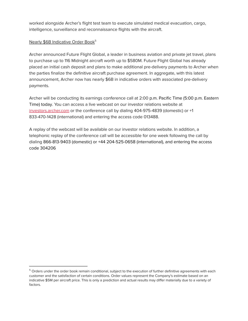 worked alongside Archer’s flight test team to execute simulated medical evacuation, cargo, intelligence, surveillance and reconnaissance flights with the aircraft. Nearly $6B Indicative Order Book5 Archer announced Future Flight Global, a leader in business aviation and private jet travel, plans to purchase up to 116 Midnight aircraft worth up to $580M. Future Flight Global has already placed an initial cash deposit and plans to make additional pre-delivery payments to Archer when the parties finalize the definitive aircraft purchase agreement. In aggregate, with this latest announcement, Archer now has nearly $6B in indicative orders with associated pre-delivery payments. Archer will be conducting its earnings conference call at 2:00 p.m. Pacific Time (5:00 p.m. Eastern Time) today. You can access a live webcast on our investor relations website at investors.archer.com or the conference call by dialing 404-975-4839 (domestic) or +1 833-470-1428 (international) and entering the access code 013488. A replay of the webcast will be available on our investor relations website. In addition, a telephonic replay of the conference call will be accessible for one week following the call by dialing 866-813-9403 (domestic) or +44 204-525-0658 (international), and entering the access code 304206 5 Orders under the order book remain conditional, subject to the execution of further definitive agreements with each customer and the satisfaction of certain conditions. Order values represent the Company’s estimate based on an indicative $5M per aircraft price. This is only a prediction and actual results may differ materially due to a variety of factors.