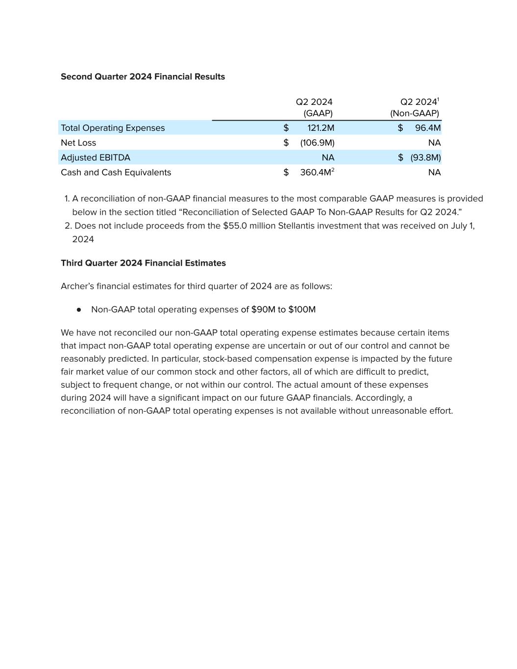 Second Quarter 2024 Financial Results Q2 2024 (GAAP) Q2 20241 (Non-GAAP) Total Operating Expenses $ 121.2M $ 96.4M Net Loss $ (106.9M) NA Adjusted EBITDA NA $ (93.8M) Cash and Cash Equivalents $ 360.4M2 NA 1. A reconciliation of non-GAAP financial measures to the most comparable GAAP measures is provided below in the section titled “Reconciliation of Selected GAAP To Non-GAAP Results for Q2 2024.” 2. Does not include proceeds from the $55.0 million Stellantis investment that was received on July 1, 2024 Third Quarter 2024 Financial Estimates Archer’s financial estimates for third quarter of 2024 are as follows: ● Non-GAAP total operating expenses of $90M to $100M We have not reconciled our non-GAAP total operating expense estimates because certain items that impact non-GAAP total operating expense are uncertain or out of our control and cannot be reasonably predicted. In particular, stock-based compensation expense is impacted by the future fair market value of our common stock and other factors, all of which are difficult to predict, subject to frequent change, or not within our control. The actual amount of these expenses during 2024 will have a significant impact on our future GAAP financials. Accordingly, a reconciliation of non-GAAP total operating expenses is not available without unreasonable effort.