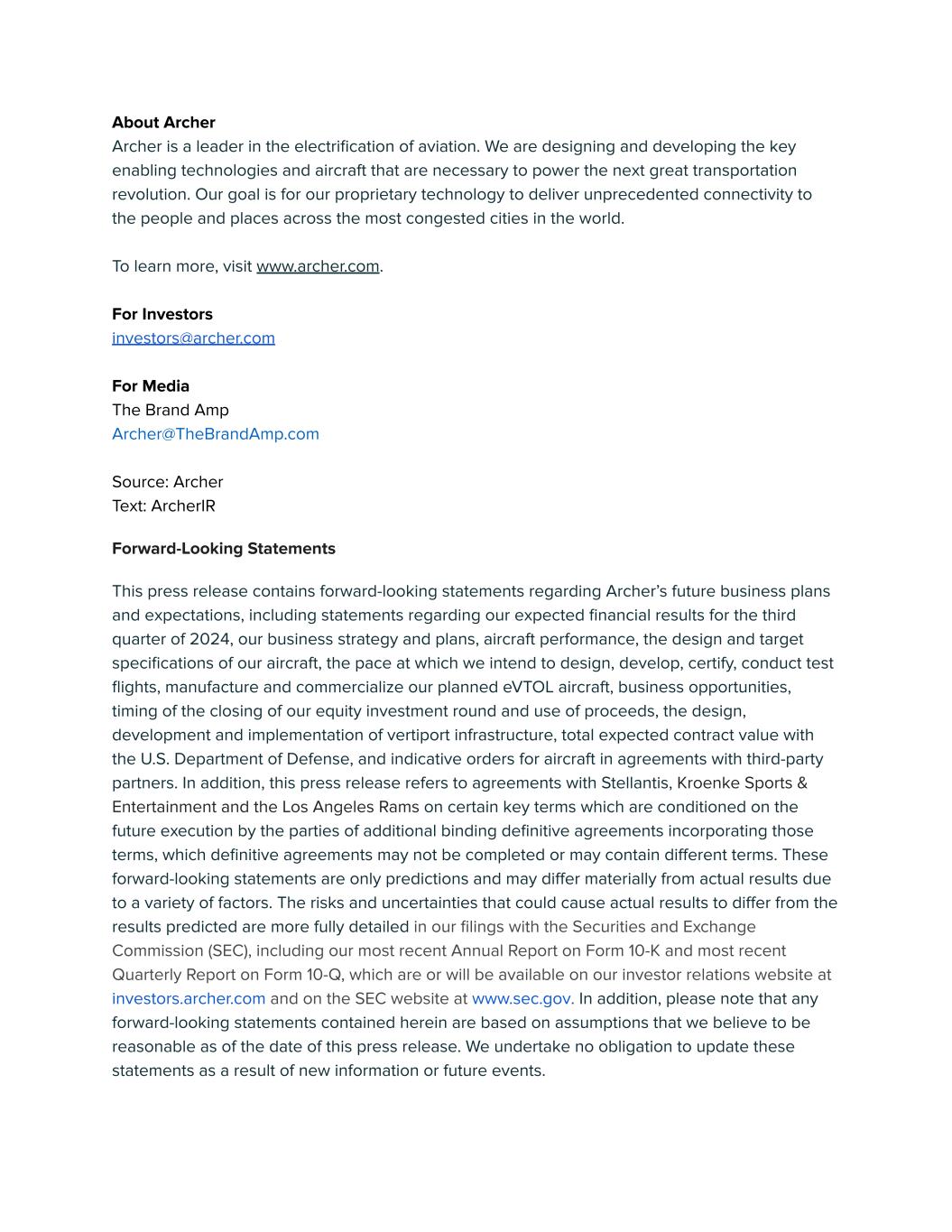 About Archer Archer is a leader in the electrification of aviation. We are designing and developing the key enabling technologies and aircraft that are necessary to power the next great transportation revolution. Our goal is for our proprietary technology to deliver unprecedented connectivity to the people and places across the most congested cities in the world. To learn more, visit www.archer.com. For Investors investors@archer.com For Media The Brand Amp Archer@TheBrandAmp.com Source: Archer Text: ArcherIR Forward-Looking Statements This press release contains forward-looking statements regarding Archer’s future business plans and expectations, including statements regarding our expected financial results for the third quarter of 2024, our business strategy and plans, aircraft performance, the design and target specifications of our aircraft, the pace at which we intend to design, develop, certify, conduct test flights, manufacture and commercialize our planned eVTOL aircraft, business opportunities, timing of the closing of our equity investment round and use of proceeds, the design, development and implementation of vertiport infrastructure, total expected contract value with the U.S. Department of Defense, and indicative orders for aircraft in agreements with third-party partners. In addition, this press release refers to agreements with Stellantis, Kroenke Sports & Entertainment and the Los Angeles Rams on certain key terms which are conditioned on the future execution by the parties of additional binding definitive agreements incorporating those terms, which definitive agreements may not be completed or may contain different terms. These forward-looking statements are only predictions and may differ materially from actual results due to a variety of factors. The risks and uncertainties that could cause actual results to differ from the results predicted are more fully detailed in our filings with the Securities and Exchange Commission (SEC), including our most recent Annual Report on Form 10-K and most recent Quarterly Report on Form 10-Q, which are or will be available on our investor relations website at investors.archer.com and on the SEC website at www.sec.gov. In addition, please note that any forward-looking statements contained herein are based on assumptions that we believe to be reasonable as of the date of this press release. We undertake no obligation to update these statements as a result of new information or future events.