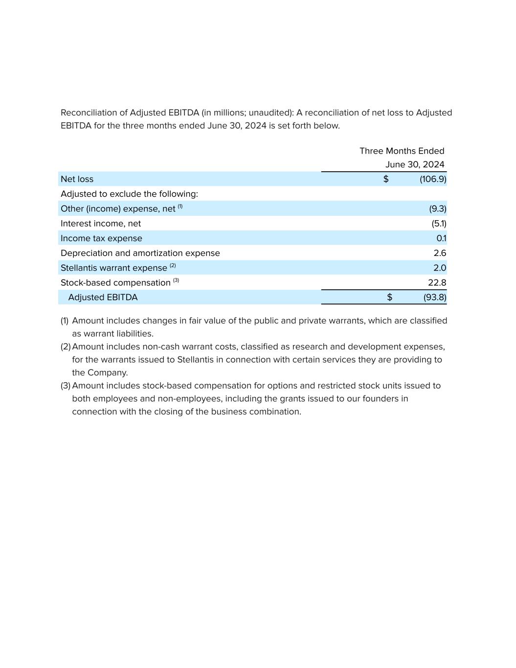 Reconciliation of Adjusted EBITDA (in millions; unaudited): A reconciliation of net loss to Adjusted EBITDA for the three months ended June 30, 2024 is set forth below. Three Months Ended June 30, 2024 Net loss $ (106.9) Adjusted to exclude the following: Other (income) expense, net (1) (9.3) Interest income, net (5.1) Income tax expense 0.1 Depreciation and amortization expense 2.6 Stellantis warrant expense (2) 2.0 Stock-based compensation (3) 22.8 Adjusted EBITDA $ (93.8) (1) Amount includes changes in fair value of the public and private warrants, which are classified as warrant liabilities. (2)Amount includes non-cash warrant costs, classified as research and development expenses, for the warrants issued to Stellantis in connection with certain services they are providing to the Company. (3) Amount includes stock-based compensation for options and restricted stock units issued to both employees and non-employees, including the grants issued to our founders in connection with the closing of the business combination.