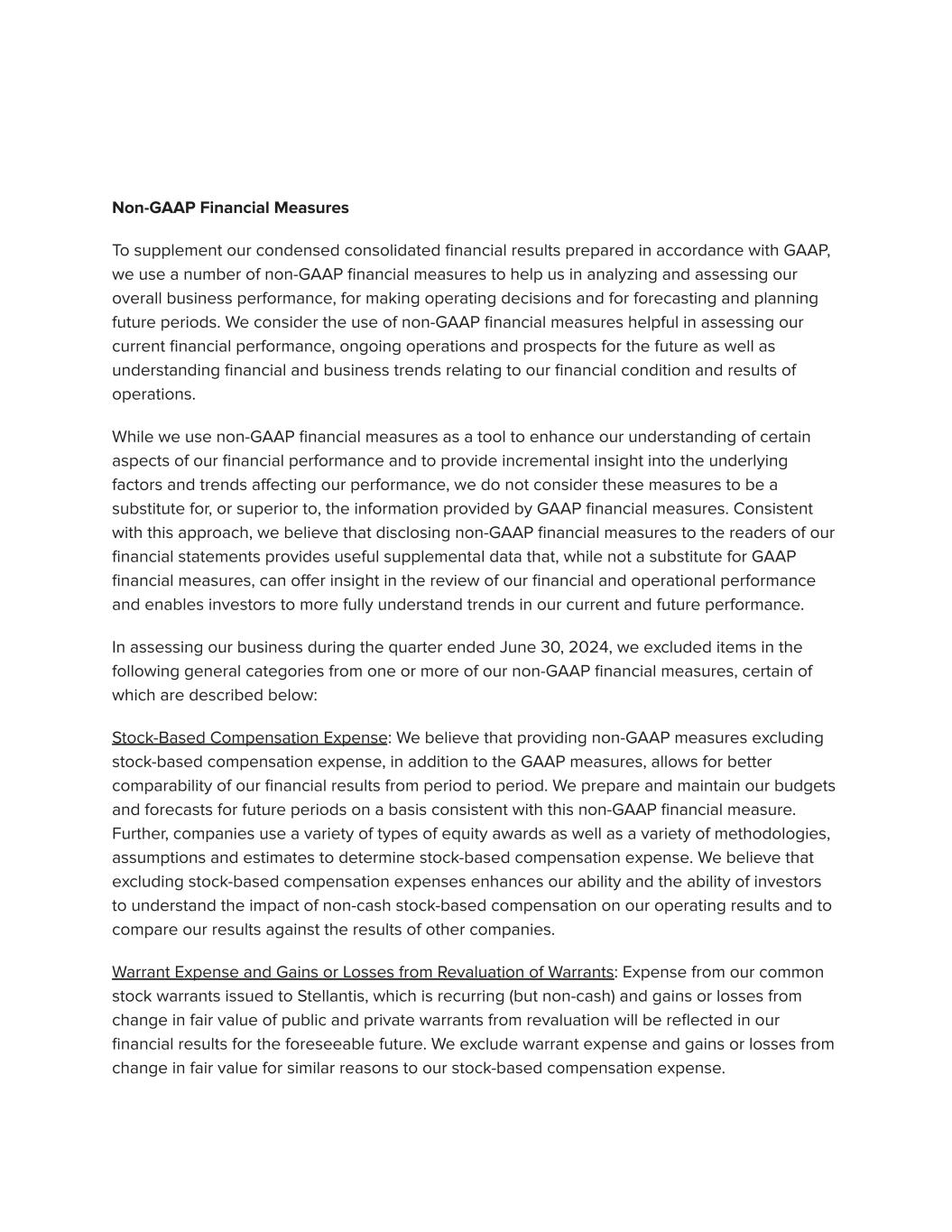 Non-GAAP Financial Measures To supplement our condensed consolidated financial results prepared in accordance with GAAP, we use a number of non-GAAP financial measures to help us in analyzing and assessing our overall business performance, for making operating decisions and for forecasting and planning future periods. We consider the use of non-GAAP financial measures helpful in assessing our current financial performance, ongoing operations and prospects for the future as well as understanding financial and business trends relating to our financial condition and results of operations. While we use non-GAAP financial measures as a tool to enhance our understanding of certain aspects of our financial performance and to provide incremental insight into the underlying factors and trends affecting our performance, we do not consider these measures to be a substitute for, or superior to, the information provided by GAAP financial measures. Consistent with this approach, we believe that disclosing non-GAAP financial measures to the readers of our financial statements provides useful supplemental data that, while not a substitute for GAAP financial measures, can offer insight in the review of our financial and operational performance and enables investors to more fully understand trends in our current and future performance. In assessing our business during the quarter ended June 30, 2024, we excluded items in the following general categories from one or more of our non-GAAP financial measures, certain of which are described below: Stock-Based Compensation Expense: We believe that providing non-GAAP measures excluding stock-based compensation expense, in addition to the GAAP measures, allows for better comparability of our financial results from period to period. We prepare and maintain our budgets and forecasts for future periods on a basis consistent with this non-GAAP financial measure. Further, companies use a variety of types of equity awards as well as a variety of methodologies, assumptions and estimates to determine stock-based compensation expense. We believe that excluding stock-based compensation expenses enhances our ability and the ability of investors to understand the impact of non-cash stock-based compensation on our operating results and to compare our results against the results of other companies. Warrant Expense and Gains or Losses from Revaluation of Warrants: Expense from our common stock warrants issued to Stellantis, which is recurring (but non-cash) and gains or losses from change in fair value of public and private warrants from revaluation will be reflected in our financial results for the foreseeable future. We exclude warrant expense and gains or losses from change in fair value for similar reasons to our stock-based compensation expense.