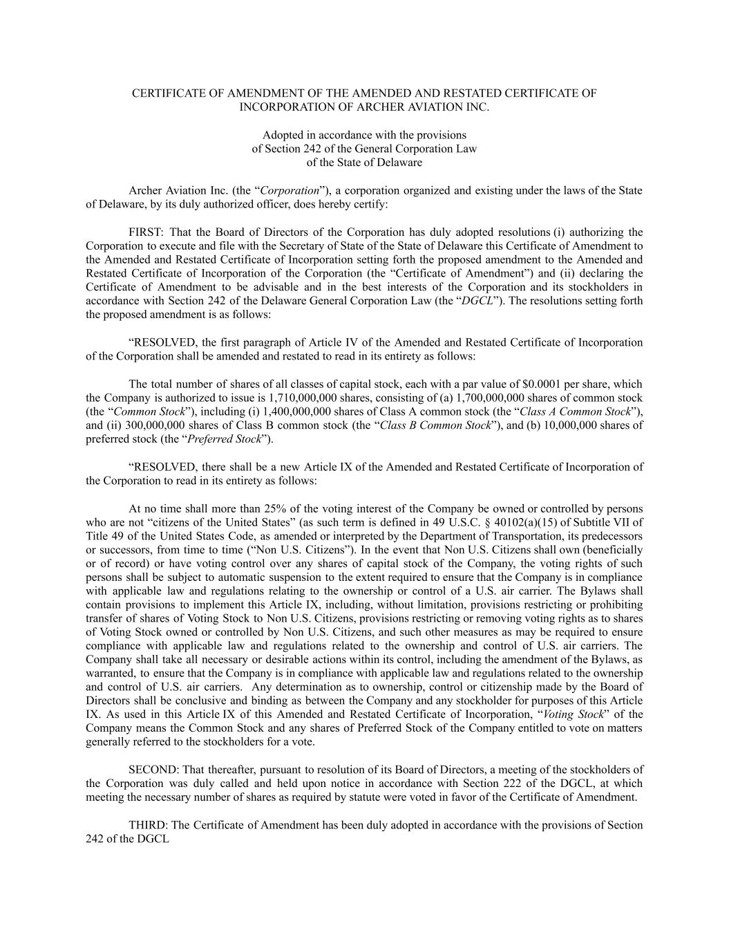 CERTIFICATE OF AMENDMENT OF THE AMENDED AND RESTATED CERTIFICATE OF INCORPORATION OF ARCHER AVIATION INC. Adopted in accordance with the provisions of Section 242 of the General Corporation Law of the State of Delaware Archer Aviation Inc. (the “Corporation”), a corporation organized and existing under the laws of the State of Delaware, by its duly authorized officer, does hereby certify: FIRST: That the Board of Directors of the Corporation has duly adopted resolutions (i) authorizing the Corporation to execute and file with the Secretary of State of the State of Delaware this Certificate of Amendment to the Amended and Restated Certificate of Incorporation setting forth the proposed amendment to the Amended and Restated Certificate of Incorporation of the Corporation (the “Certificate of Amendment”) and (ii) declaring the Certificate of Amendment to be advisable and in the best interests of the Corporation and its stockholders in accordance with Section 242 of the Delaware General Corporation Law (the “DGCL”). The resolutions setting forth the proposed amendment is as follows: “RESOLVED, the first paragraph of Article IV of the Amended and Restated Certificate of Incorporation of the Corporation shall be amended and restated to read in its entirety as follows: The total number of shares of all classes of capital stock, each with a par value of $0.0001 per share, which the Company is authorized to issue is 1,710,000,000 shares, consisting of (a) 1,700,000,000 shares of common stock (the “Common Stock”), including (i) 1,400,000,000 shares of Class A common stock (the “Class A Common Stock”), and (ii) 300,000,000 shares of Class B common stock (the “Class B Common Stock”), and (b) 10,000,000 shares of preferred stock (the “Preferred Stock”). “RESOLVED, there shall be a new Article IX of the Amended and Restated Certificate of Incorporation of the Corporation to read in its entirety as follows: At no time shall more than 25% of the voting interest of the Company be owned or controlled by persons who are not “citizens of the United States” (as such term is defined in 49 U.S.C. § 40102(a)(15) of Subtitle VII of Title 49 of the United States Code, as amended or interpreted by the Department of Transportation, its predecessors or successors, from time to time (“Non U.S. Citizens”). In the event that Non U.S. Citizens shall own (beneficially or of record) or have voting control over any shares of capital stock of the Company, the voting rights of such persons shall be subject to automatic suspension to the extent required to ensure that the Company is in compliance with applicable law and regulations relating to the ownership or control of a U.S. air carrier. The Bylaws shall contain provisions to implement this Article IX, including, without limitation, provisions restricting or prohibiting transfer of shares of Voting Stock to Non U.S. Citizens, provisions restricting or removing voting rights as to shares of Voting Stock owned or controlled by Non U.S. Citizens, and such other measures as may be required to ensure compliance with applicable law and regulations related to the ownership and control of U.S. air carriers. The Company shall take all necessary or desirable actions within its control, including the amendment of the Bylaws, as warranted, to ensure that the Company is in compliance with applicable law and regulations related to the ownership and control of U.S. air carriers. Any determination as to ownership, control or citizenship made by the Board of Directors shall be conclusive and binding as between the Company and any stockholder for purposes of this Article IX. As used in this Article IX of this Amended and Restated Certificate of Incorporation, “Voting Stock” of the Company means the Common Stock and any shares of Preferred Stock of the Company entitled to vote on matters generally referred to the stockholders for a vote. SECOND: That thereafter, pursuant to resolution of its Board of Directors, a meeting of the stockholders of the Corporation was duly called and held upon notice in accordance with Section 222 of the DGCL, at which meeting the necessary number of shares as required by statute were voted in favor of the Certificate of Amendment. THIRD: The Certificate of Amendment has been duly adopted in accordance with the provisions of Section 242 of the DGCL