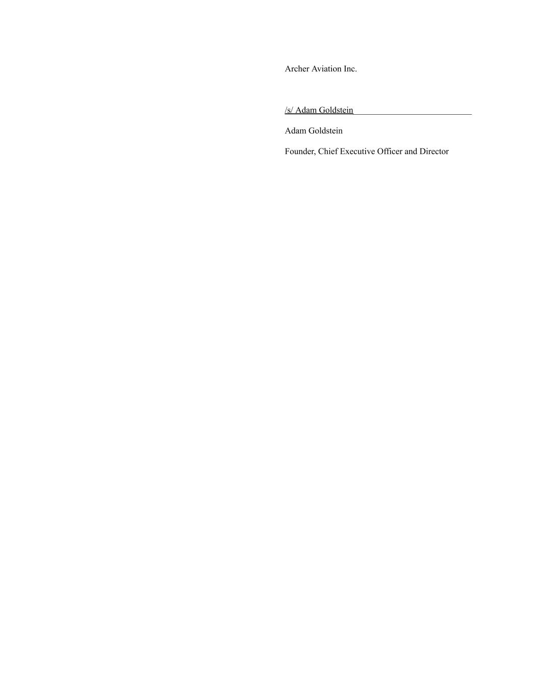 Archer Aviation Inc. /s/ Adam Goldstein___________________________ Adam Goldstein Founder, Chief Executive Officer and Director