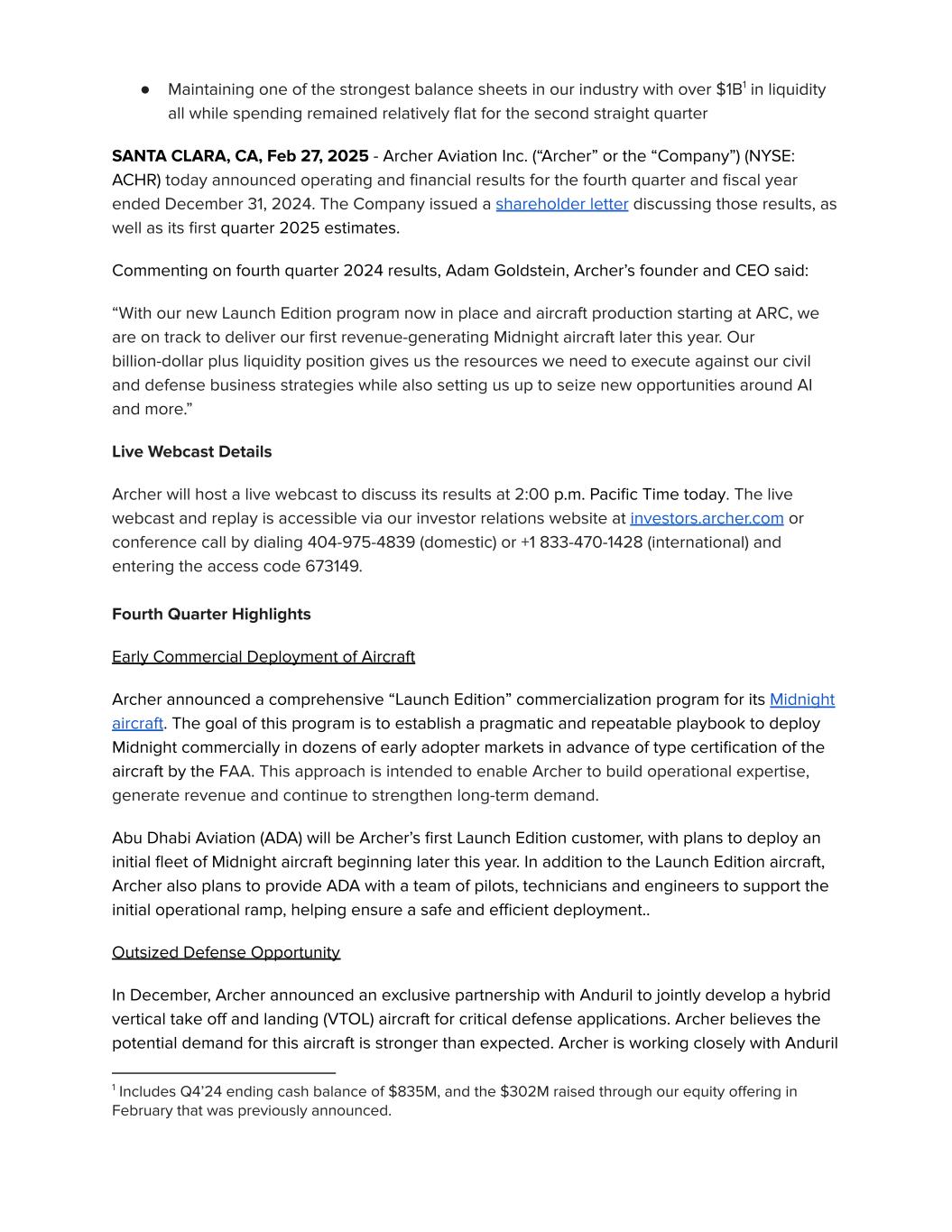 ● Maintaining one of the strongest balance sheets in our industry with over $1B1 in liquidity all while spending remained relatively flat for the second straight quarter SANTA CLARA, CA, Feb 27, 2025 - Archer Aviation Inc. (“Archer” or the “Company”) (NYSE: ACHR) today announced operating and financial results for the fourth quarter and fiscal year ended December 31, 2024. The Company issued a shareholder letter discussing those results, as well as its first quarter 2025 estimates. Commenting on fourth quarter 2024 results, Adam Goldstein, Archer’s founder and CEO said: “With our new Launch Edition program now in place and aircraft production starting at ARC, we are on track to deliver our first revenue-generating Midnight aircraft later this year. Our billion-dollar plus liquidity position gives us the resources we need to execute against our civil and defense business strategies while also setting us up to seize new opportunities around AI and more.” Live Webcast Details Archer will host a live webcast to discuss its results at 2:00 p.m. Pacific Time today. The live webcast and replay is accessible via our investor relations website at investors.archer.com or conference call by dialing 404-975-4839 (domestic) or +1 833-470-1428 (international) and entering the access code 673149. Fourth Quarter Highlights Early Commercial Deployment of Aircraft Archer announced a comprehensive “Launch Edition” commercialization program for its Midnight aircraft. The goal of this program is to establish a pragmatic and repeatable playbook to deploy Midnight commercially in dozens of early adopter markets in advance of type certification of the aircraft by the FAA. This approach is intended to enable Archer to build operational expertise, generate revenue and continue to strengthen long-term demand. Abu Dhabi Aviation (ADA) will be Archer’s first Launch Edition customer, with plans to deploy an initial fleet of Midnight aircraft beginning later this year. In addition to the Launch Edition aircraft, Archer also plans to provide ADA with a team of pilots, technicians and engineers to support the initial operational ramp, helping ensure a safe and efficient deployment.. Outsized Defense Opportunity In December, Archer announced an exclusive partnership with Anduril to jointly develop a hybrid vertical take off and landing (VTOL) aircraft for critical defense applications. Archer believes the potential demand for this aircraft is stronger than expected. Archer is working closely with Anduril 1 Includes Q4’24 ending cash balance of $835M, and the $302M raised through our equity offering in February that was previously announced.