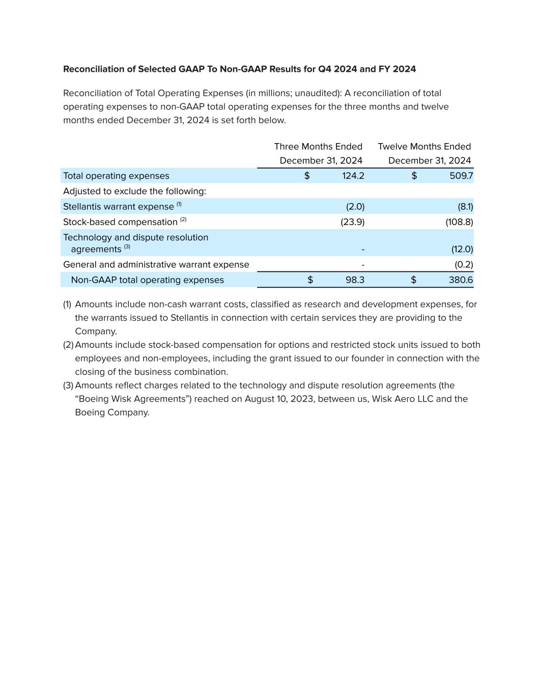 Reconciliation of Selected GAAP To Non-GAAP Results for Q4 2024 and FY 2024 Reconciliation of Total Operating Expenses (in millions; unaudited): A reconciliation of total operating expenses to non-GAAP total operating expenses for the three months and twelve months ended December 31, 2024 is set forth below. Three Months Ended December 31, 2024 Twelve Months Ended December 31, 2024 Total operating expenses $ 124.2 $ 509.7 Adjusted to exclude the following: Stellantis warrant expense (1) (2.0) (8.1) Stock-based compensation (2) (23.9) (108.8) Technology and dispute resolution agreements (3) - (12.0) General and administrative warrant expense - (0.2) Non-GAAP total operating expenses $ 98.3 $ 380.6 (1) Amounts include non-cash warrant costs, classified as research and development expenses, for the warrants issued to Stellantis in connection with certain services they are providing to the Company. (2) Amounts include stock-based compensation for options and restricted stock units issued to both employees and non-employees, including the grant issued to our founder in connection with the closing of the business combination. (3) Amounts reflect charges related to the technology and dispute resolution agreements (the “Boeing Wisk Agreements”) reached on August 10, 2023, between us, Wisk Aero LLC and the Boeing Company.