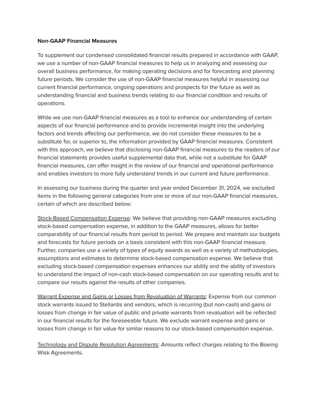 Non-GAAP Financial Measures To supplement our condensed consolidated financial results prepared in accordance with GAAP, we use a number of non-GAAP financial measures to help us in analyzing and assessing our overall business performance, for making operating decisions and for forecasting and planning future periods. We consider the use of non-GAAP financial measures helpful in assessing our current financial performance, ongoing operations and prospects for the future as well as understanding financial and business trends relating to our financial condition and results of operations. While we use non-GAAP financial measures as a tool to enhance our understanding of certain aspects of our financial performance and to provide incremental insight into the underlying factors and trends affecting our performance, we do not consider these measures to be a substitute for, or superior to, the information provided by GAAP financial measures. Consistent with this approach, we believe that disclosing non-GAAP financial measures to the readers of our financial statements provides useful supplemental data that, while not a substitute for GAAP financial measures, can offer insight in the review of our financial and operational performance and enables investors to more fully understand trends in our current and future performance. In assessing our business during the quarter and year ended December 31, 2024, we excluded items in the following general categories from one or more of our non-GAAP financial measures, certain of which are described below: Stock-Based Compensation Expense: We believe that providing non-GAAP measures excluding stock-based compensation expense, in addition to the GAAP measures, allows for better comparability of our financial results from period to period. We prepare and maintain our budgets and forecasts for future periods on a basis consistent with this non-GAAP financial measure. Further, companies use a variety of types of equity awards as well as a variety of methodologies, assumptions and estimates to determine stock-based compensation expense. We believe that excluding stock-based compensation expenses enhances our ability and the ability of investors to understand the impact of non-cash stock-based compensation on our operating results and to compare our results against the results of other companies. Warrant Expense and Gains or Losses from Revaluation of Warrants: Expense from our common stock warrants issued to Stellantis and vendors, which is recurring (but non-cash) and gains or losses from change in fair value of public and private warrants from revaluation will be reflected in our financial results for the foreseeable future. We exclude warrant expense and gains or losses from change in fair value for similar reasons to our stock-based compensation expense. Technology and Dispute Resolution Agreements: Amounts reflect charges relating to the Boeing Wisk Agreements.