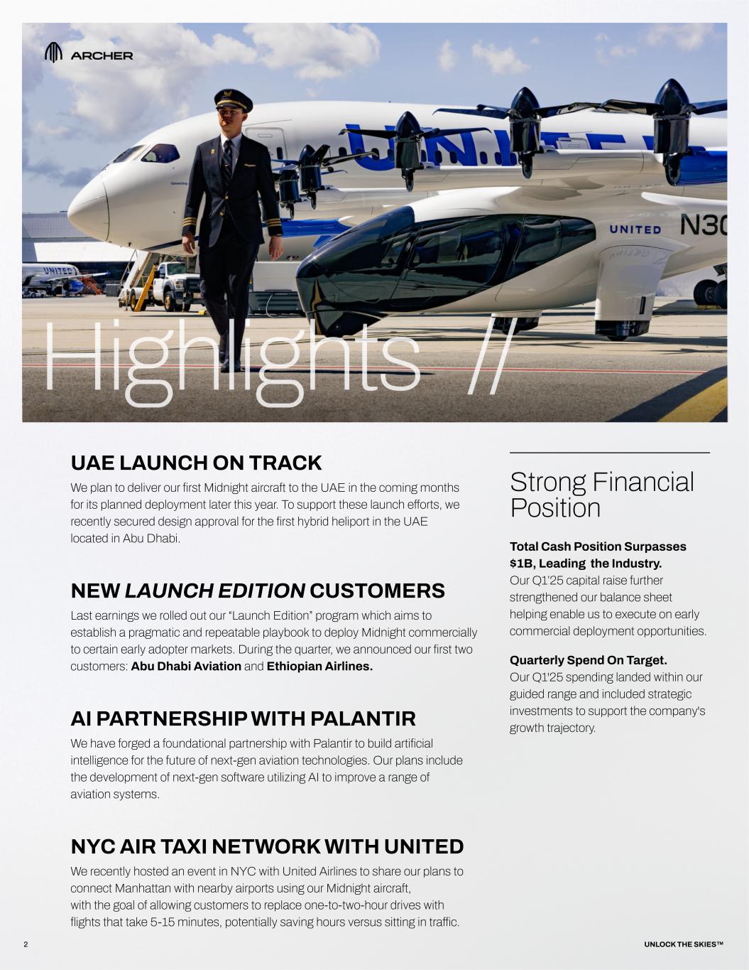 Strong Financial Position Total Cash Position Surpasses $1B, Leading the Industry. Our Q1’25 capital raise further strengthened our balance sheet helping enable us to execute on early commercial deployment opportunities. Quarterly Spend On Target. Our Q1'25 spending landed within our guided range and included strategic investments to support the company's growth trajectory. 2 AI PARTNERSHIP WITH PALANTIR We have forged a foundational partnership with Palantir to build artificial intelligence for the future of next-gen aviation technologies. Our plans include the development of next-gen software utilizing AI to improve a range of aviation systems. NEW LAUNCH EDITION CUSTOMERS Last earnings we rolled out our “Launch Edition” program which aims to establish a pragmatic and repeatable playbook to deploy Midnight commercially to certain early adopter markets. During the quarter, we announced our first two customers: Abu Dhabi Aviation and Ethiopian Airlines. NYC AIR TAXI NETWORK WITH UNITED We recently hosted an event in NYC with United Airlines to share our plans to connect Manhattan with nearby airports using our Midnight aircraft, with the goal of allowing customers to replace one-to-two-hour drives with flights that take 5-15 minutes, potentially saving hours versus sitting in traffic. UNLOCK THE SKIES™ UAE LAUNCH ON TRACK We plan to deliver our first Midnight aircraft to the UAE in the coming months for its planned deployment later this year. To support these launch efforts, we recently secured design approval for the first hybrid heliport in the UAE located in Abu Dhabi.