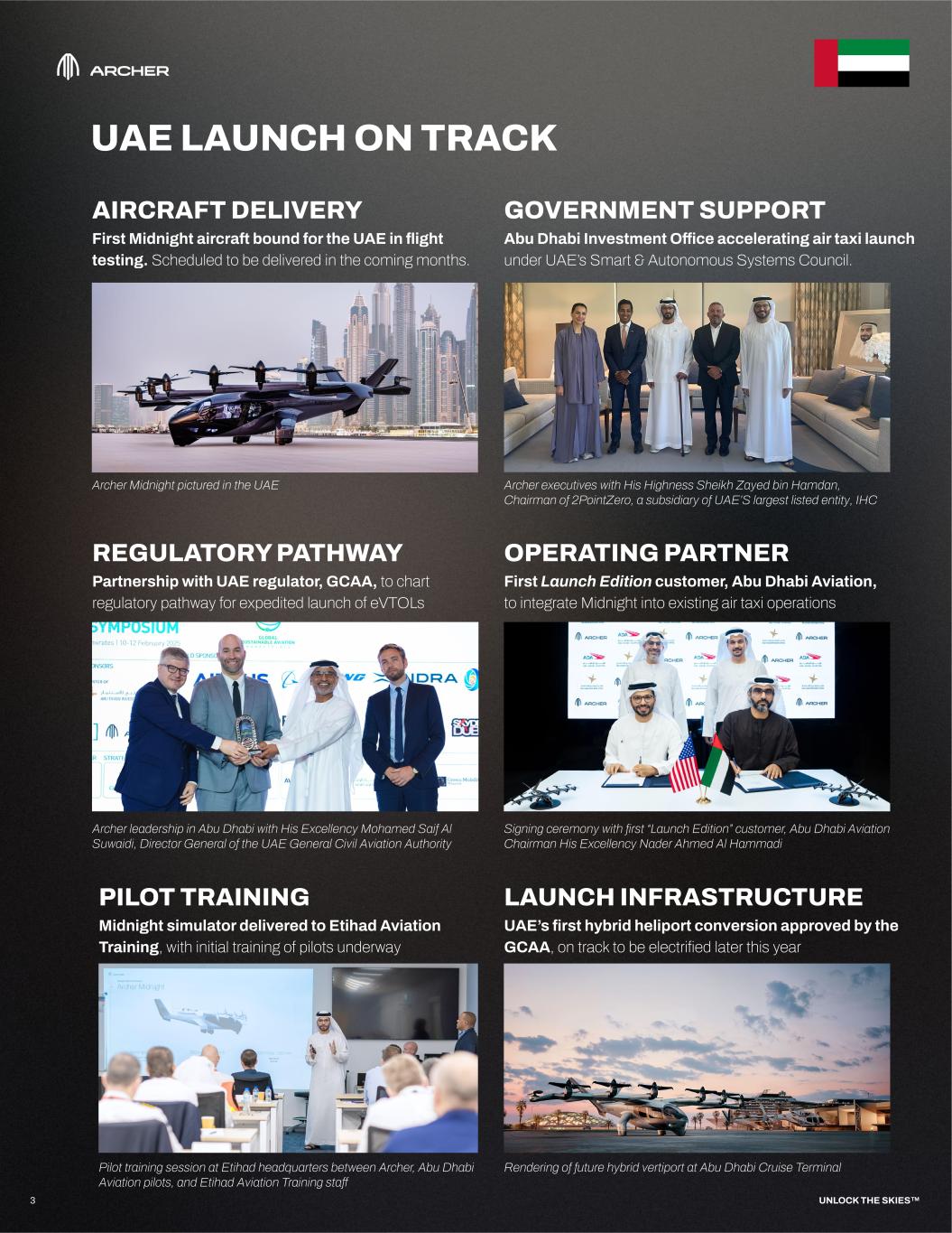 3 UAE LAUNCH ON TRACK UNLOCK THE SKIES™ AIRCRAFT DELIVERY First Midnight aircraft bound for the UAE in flight testing. Scheduled to be delivered in the coming months. Archer Midnight pictured in the UAE GOVERNMENT SUPPORT Abu Dhabi Investment Office accelerating air taxi launch under UAE’s Smart & Autonomous Systems Council. Archer executives with His Highness Sheikh Zayed bin Hamdan, Chairman of 2PointZero, a subsidiary of UAE’S largest listed entity, IHC REGULATORY PATHWAY Partnership with UAE regulator, GCAA, to chart regulatory pathway for expedited launch of eVTOLs Archer leadership in Abu Dhabi with His Excellency Mohamed Saif Al Suwaidi, Director General of the UAE General Civil Aviation Authority OPERATING PARTNER First Launch Edition customer, Abu Dhabi Aviation, to integrate Midnight into existing air taxi operations Signing ceremony with first “Launch Edition” customer, Abu Dhabi Aviation Chairman His Excellency Nader Ahmed Al Hammadi PILOT TRAINING Midnight simulator delivered to Etihad Aviation Training, with initial training of pilots underway Pilot training session at Etihad headquarters between Archer, Abu Dhabi Aviation pilots, and Etihad Aviation Training staff LAUNCH INFRASTRUCTURE UAE’s first hybrid heliport conversion approved by the GCAA, on track to be electrified later this year Rendering of future hybrid vertiport at Abu Dhabi Cruise Terminal
