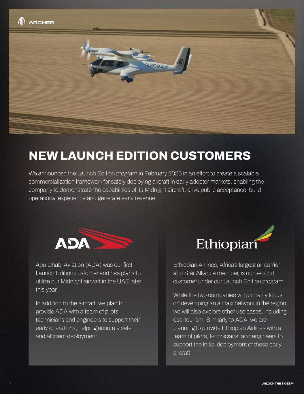 4 NEW LAUNCH EDITION CUSTOMERS We announced the Launch Edition program in February 2025 in an effort to create a scalable commercialization framework for safely deploying aircraft in early adopter markets, enabling the company to demonstrate the capabilities of its Midnight aircraft, drive public acceptance, build operational experience and generate early revenue. Ethiopian Airlines, Africa’s largest air carrier and Star Alliance member, is our second customer under our Launch Edition program. While the two companies will primarily focus on developing an air taxi network in the region, we will also explore other use cases, including eco-tourism. Similarly to ADA, we are planning to provide Ethiopian Airlines with a team of pilots, technicians, and engineers to support the initial deployment of these early aircraft. UNLOCK THE SKIES™ L A U N C H E D I T I O N Abu Dhabi Aviation (ADA) was our first Launch Edition customer and has plans to utilize our Midnight aircraft in the UAE later this year. In addition to the aircraft, we plan to provide ADA with a team of pilots, technicians and engineers to support their early operations, helping ensure a safe and efficient deployment.