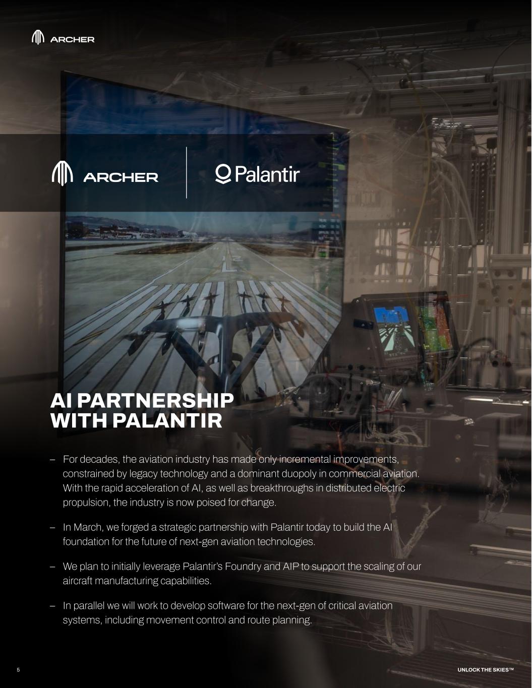 AI PARTNERSHIP WITH PALANTIR – For decades, the aviation industry has made only incremental improvements, constrained by legacy technology and a dominant duopoly in commercial aviation. With the rapid acceleration of AI, as well as breakthroughs in distributed electric propulsion, the industry is now poised for change. – In March, we forged a strategic partnership with Palantir today to build the AI foundation for the future of next-gen aviation technologies. – We plan to initially leverage Palantir’s Foundry and AIP to support the scaling of our aircraft manufacturing capabilities. – In parallel we will work to develop software for the next-gen of critical aviation systems, including movement control and route planning. 5 UNLOCK THE SKIES™