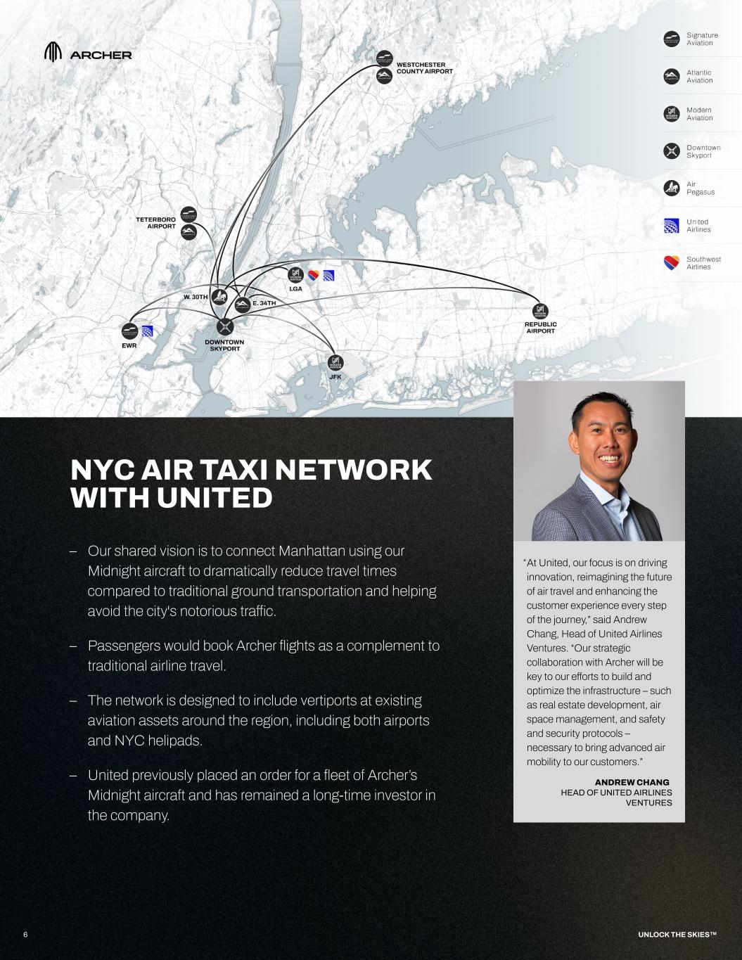NYC AIR TAXI NETWORK WITH UNITED – Our shared vision is to connect Manhattan using our Midnight aircraft to dramatically reduce travel times compared to traditional ground transportation and helping avoid the city's notorious traffic. – Passengers would book Archer flights as a complement to traditional airline travel. – The network is designed to include vertiports at existing aviation assets around the region, including both airports and NYC helipads. – United previously placed an order for a fleet of Archer’s Midnight aircraft and has remained a long-time investor in the company. SoFi Stadium 6 UNLOCK THE SKIES™ At United, our focus is on driving innovation, reimagining the future of air travel and enhancing the customer experience every step of the journey,” said Andrew Chang, Head of United Airlines Ventures. “Our strategic collaboration with Archer will be key to our efforts to build and optimize the infrastructure – such as real estate development, air space management, and safety and security protocols – necessary to bring advanced air mobility to our customers.” “ ANDREW CHANG HEAD OF UNITED AIRLINES VENTURES