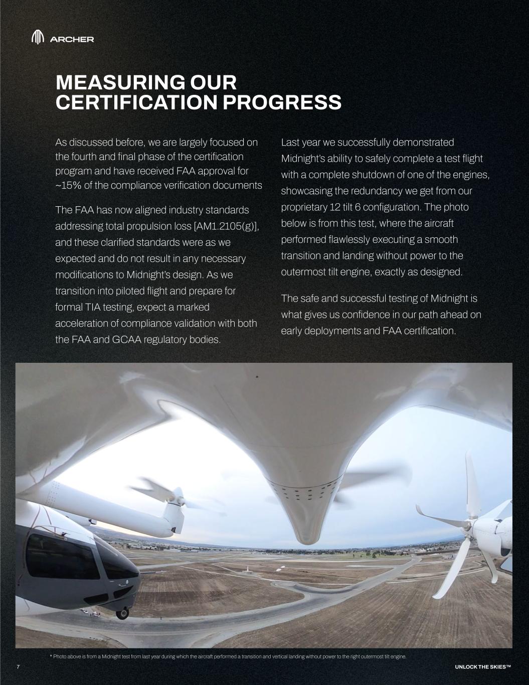 7 MEASURING OUR CERTIFICATION PROGRESS As discussed before, we are largely focused on the fourth and final phase of the certification program and have received FAA approval for ~15% of the compliance verification documents The FAA has now aligned industry standards addressing total propulsion loss [AM1.2105(g)], and these clarified standards were as we expected and do not result in any necessary modifications to Midnight’s design. As we transition into piloted flight and prepare for formal TIA testing, expect a marked acceleration of compliance validation with both the FAA and GCAA regulatory bodies. Last year we successfully demonstrated Midnight’s ability to safely complete a test flight with a complete shutdown of one of the engines, showcasing the redundancy we get from our proprietary 12 tilt 6 configuration. The photo below is from this test, where the aircraft performed flawlessly executing a smooth transition and landing without power to the outermost tilt engine, exactly as designed. The safe and successful testing of Midnight is what gives us confidence in our path ahead on early deployments and FAA certification. UNLOCK THE SKIES™ * Photo above is from a Midnight test from last year during which the aircraft performed a transition and vertical landing without power to the right outermost tilt engine.