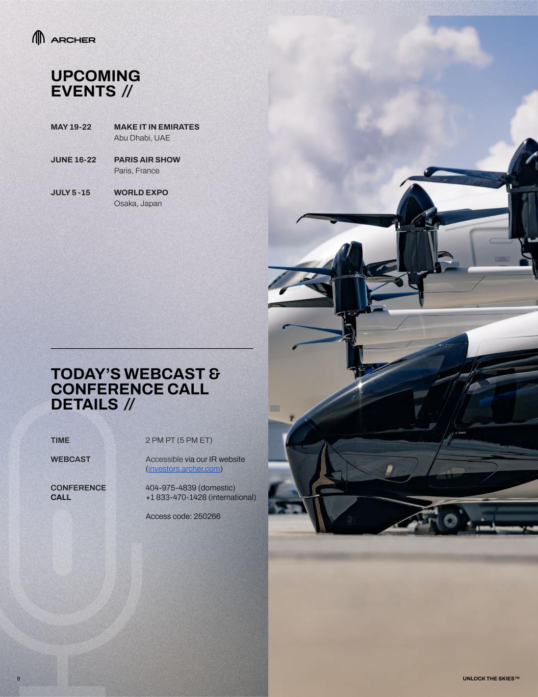 MAY 19-22 MAKE IT IN EMIRATES Abu Dhabi, UAE JUNE 16-22 PARIS AIR SHOW Paris, France JULY 5 -15 WORLD EXPO Osaka, Japan UPCOMING EVENTS // TIME 2 PM PT (5 PM ET) WEBCAST Accessible via our IR website (investors.archer.com) CONFERENCE 404-975-4839 (domestic) CALL +1 833-470-1428 (international) Access code: 250266 TODAY’S WEBCAST & CONFERENCE CALL DETAILS // 8 UNLOCK THE SKIES™