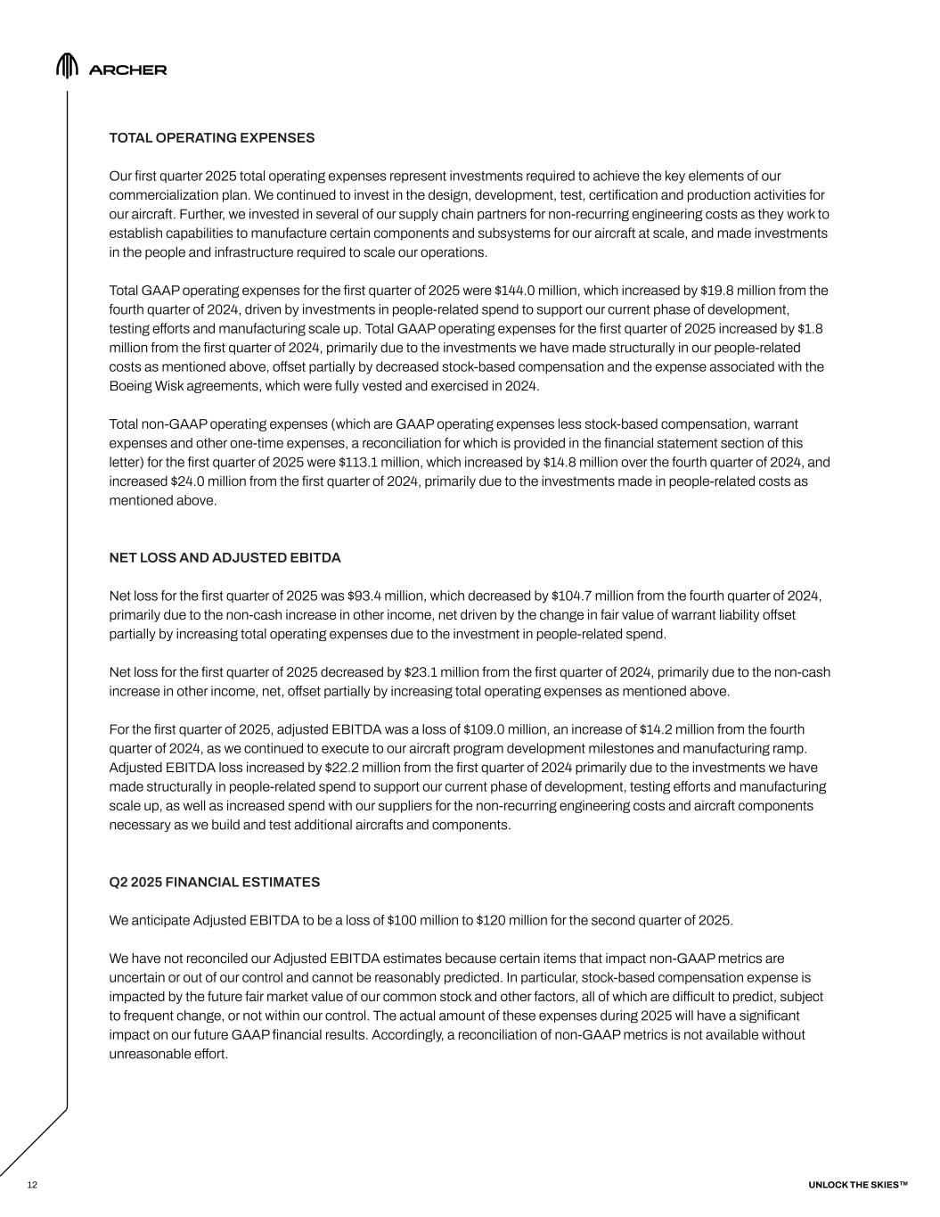 12 TOTAL OPERATING EXPENSES Our first quarter 2025 total operating expenses represent investments required to achieve the key elements of our commercialization plan. We continued to invest in the design, development, test, certification and production activities for our aircraft. Further, we invested in several of our supply chain partners for non-recurring engineering costs as they work to establish capabilities to manufacture certain components and subsystems for our aircraft at scale, and made investments in the people and infrastructure required to scale our operations. Total GAAP operating expenses for the first quarter of 2025 were $144.0 million, which increased by $19.8 million from the fourth quarter of 2024, driven by investments in people-related spend to support our current phase of development, testing efforts and manufacturing scale up. Total GAAP operating expenses for the first quarter of 2025 increased by $1.8 million from the first quarter of 2024, primarily due to the investments we have made structurally in our people-related costs as mentioned above, offset partially by decreased stock-based compensation and the expense associated with the Boeing Wisk agreements, which were fully vested and exercised in 2024. Total non-GAAP operating expenses (which are GAAP operating expenses less stock-based compensation, warrant expenses and other one-time expenses, a reconciliation for which is provided in the financial statement section of this letter) for the first quarter of 2025 were $113.1 million, which increased by $14.8 million over the fourth quarter of 2024, and increased $24.0 million from the first quarter of 2024, primarily due to the investments made in people-related costs as mentioned above. NET LOSS AND ADJUSTED EBITDA Net loss for the first quarter of 2025 was $93.4 million, which decreased by $104.7 million from the fourth quarter of 2024, primarily due to the non-cash increase in other income, net driven by the change in fair value of warrant liability offset partially by increasing total operating expenses due to the investment in people-related spend. Net loss for the first quarter of 2025 decreased by $23.1 million from the first quarter of 2024, primarily due to the non-cash increase in other income, net, offset partially by increasing total operating expenses as mentioned above. For the first quarter of 2025, adjusted EBITDA was a loss of $109.0 million, an increase of $14.2 million from the fourth quarter of 2024, as we continued to execute to our aircraft program development milestones and manufacturing ramp. Adjusted EBITDA loss increased by $22.2 million from the first quarter of 2024 primarily due to the investments we have made structurally in people-related spend to support our current phase of development, testing efforts and manufacturing scale up, as well as increased spend with our suppliers for the non-recurring engineering costs and aircraft components necessary as we build and test additional aircrafts and components. Q2 2025 FINANCIAL ESTIMATES We anticipate Adjusted EBITDA to be a loss of $100 million to $120 million for the second quarter of 2025. We have not reconciled our Adjusted EBITDA estimates because certain items that impact non-GAAP metrics are uncertain or out of our control and cannot be reasonably predicted. In particular, stock-based compensation expense is impacted by the future fair market value of our common stock and other factors, all of which are difficult to predict, subject to frequent change, or not within our control. The actual amount of these expenses during 2025 will have a significant impact on our future GAAP financial results. Accordingly, a reconciliation of non-GAAP metrics is not available without unreasonable effort. UNLOCK THE SKIES™
