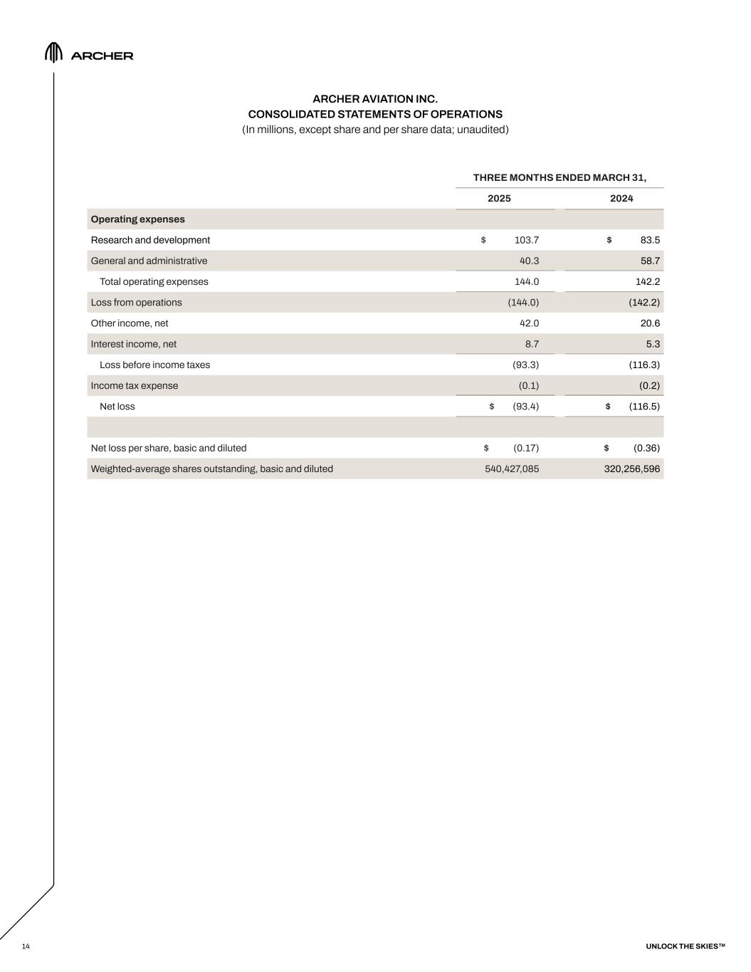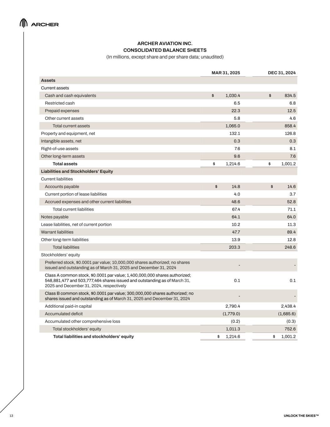 ARCHER AVIATION INC. CONSOLIDATED BALANCE SHEETS (In millions, except share and per share data; unaudited) 13 MAR 31, 2025 DEC 31, 2024 Assets Current assets Cash and cash equivalents $ 1,030.4 $ 834.5 Restricted cash 6.5 6.8 Prepaid expenses 22.3 12.5 Other current assets 5.8 4.6 Total current assets 1,065.0 858.4 Property and equipment, net 132.1 126.8 Intangible assets, net 0.3 0.3 Right-of-use assets 7.6 8.1 Other long-term assets 9.6 7.6 Total assets $ 1,214.6 $ 1,001.2 Liabilities and Stockholders’ Equity Current liabilities Accounts payable $ 14.8 $ 14.6 Current portion of lease liabilities 4.0 3.7 Accrued expenses and other current liabilities 48.6 52.8 Total current liabilities 67.4 71.1 Notes payable 64.1 64.0 Lease liabilities, net of current portion 10.2 11.3 Warrant liabilities 47.7 89.4 Other long-term liabilities 13.9 12.8 Total liabilities 203.3 248.6 Stockholders’ equity Preferred stock, $0.0001 par value; 10,000,000 shares authorized; no shares issued and outstanding as of March 31, 2025 and December 31, 2024 - - Class A common stock, $0.0001 par value; 1,400,000,000 shares authorized; 548,881,477 and 503,777,464 shares issued and outstanding as of March 31, 2025 and December 31, 2024, respectively 0.1 0.1 Class B common stock, $0.0001 par value; 300,000,000 shares authorized; no shares issued and outstanding as of March 31, 2025 and December 31, 2024 - - Additional paid-in capital 2,790.4 2,438.4 Accumulated deficit (1,779.0) (1,685.6) Accumulated other comprehensive loss (0.2) (0.3) Total stockholders’ equity 1,011.3 752.6 Total liabilities and stockholders’ equity $ 1,214.6 $ 1,001.2 UNLOCK THE SKIES™