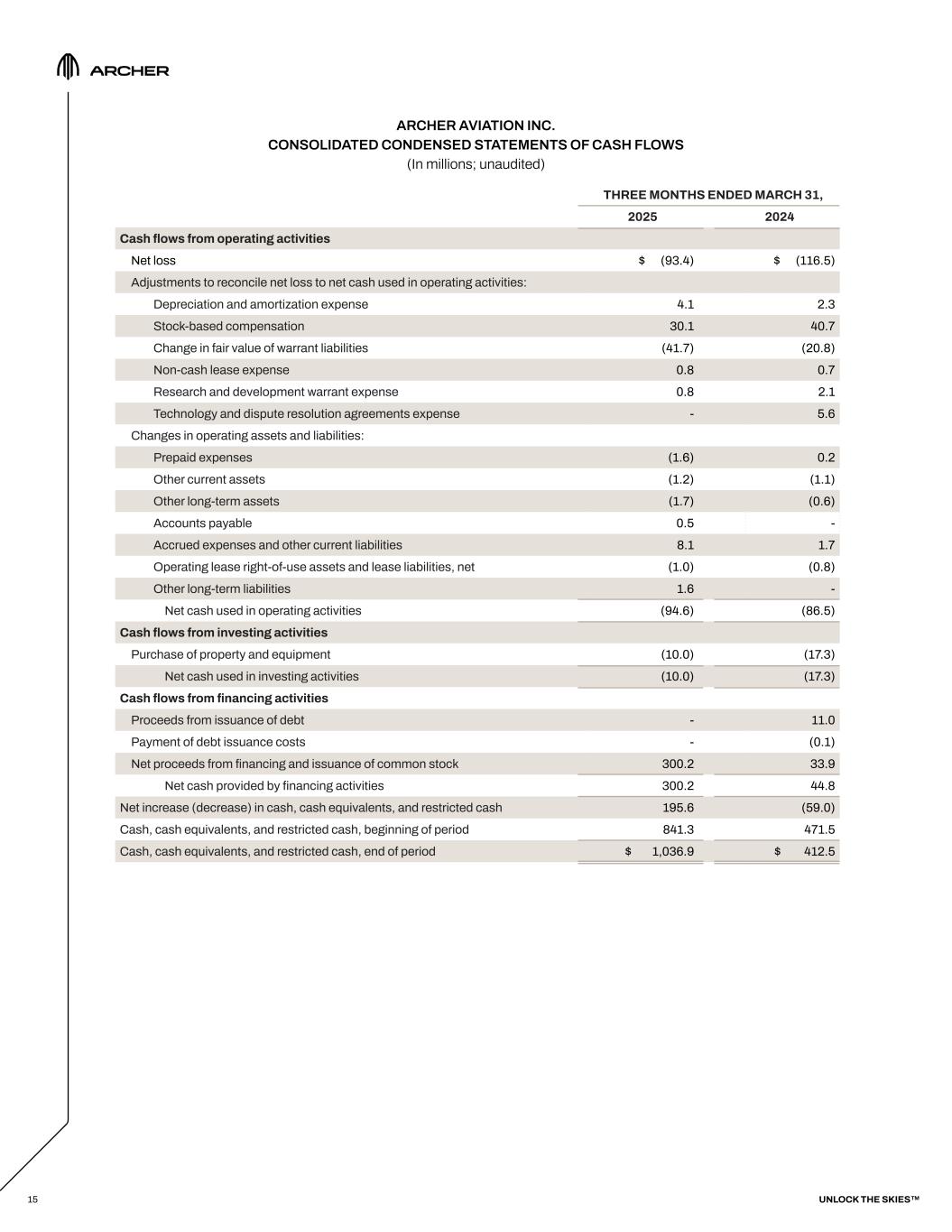 ARCHER AVIATION INC. CONSOLIDATED CONDENSED STATEMENTS OF CASH FLOWS (In millions; unaudited) 15 THREE MONTHS ENDED MARCH 31, 2025 2024 Cash flows from operating activities Net loss $ (93.4) $ (116.5) Adjustments to reconcile net loss to net cash used in operating activities: Depreciation and amortization expense 4.1 2.3 Stock-based compensation 30.1 40.7 Change in fair value of warrant liabilities (41.7) (20.8) Non-cash lease expense 0.8 0.7 Research and development warrant expense 0.8 2.1 Technology and dispute resolution agreements expense - 5.6 Changes in operating assets and liabilities: Prepaid expenses (1.6) 0.2 Other current assets (1.2) (1.1) Other long-term assets (1.7) (0.6) Accounts payable 0.5 - Accrued expenses and other current liabilities 8.1 1.7 Operating lease right-of-use assets and lease liabilities, net (1.0) (0.8) Other long-term liabilities 1.6 - Net cash used in operating activities (94.6) (86.5) Cash flows from investing activities Purchase of property and equipment (10.0) (17.3) Net cash used in investing activities (10.0) (17.3) Cash flows from financing activities Proceeds from issuance of debt - 11.0 Payment of debt issuance costs - (0.1) Net proceeds from financing and issuance of common stock 300.2 33.9 Net cash provided by financing activities 300.2 44.8 Net increase (decrease) in cash, cash equivalents, and restricted cash 195.6 (59.0) Cash, cash equivalents, and restricted cash, beginning of period 841.3 471.5 Cash, cash equivalents, and restricted cash, end of period $ 1,036.9 $ 412.5 UNLOCK THE SKIES™