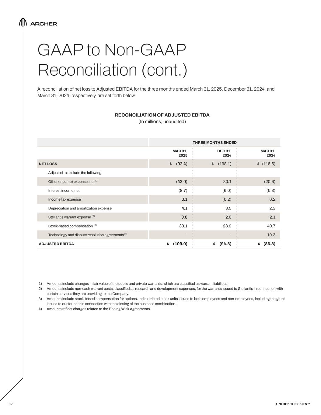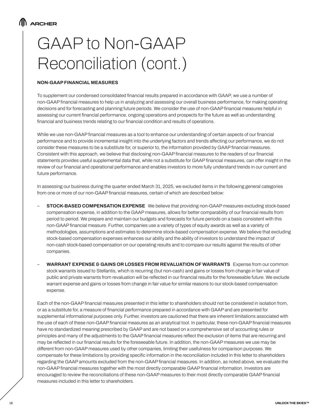 GAAP to Non-GAAP Reconciliation A reconciliation of total operating expenses to non-GAAP total operating expenses for the three months ended March 31, 2025, December 31, 2024, and March 31, 2024, respectively, are set forth below. RECONCILIATION OF OPERATING EXPENSES (In millions; unaudited) 1) Amounts include non-cash warrant costs, classified as research and development expenses, for the warrants issued to Stellantis N.V. and its subsidiaries (“Stellantis”) in connection with certain services they are providing to the Company. 2) Amounts include stock-based compensation for options and restricted stock units issued to both employees and non-employees, including the grant issued to our founder in connection with the closing of the business combination. 3) Amounts reflect charges relating to the Boeing Wisk Agreements. 16 THREE MONTHS ENDED MAR 31, 2025 DEC 31, 2024 MAR 31, 2024 TOTAL OPERATING EXPENSES $ 144.0 $ 124.2 $ 142.2 Adjusted to exclude the following: Stellantis warrant expense (1) (0.8) (2.0) (2.1) Stock-based compensation (2) (30.1) (23.9) (40.7) Technology and dispute resolution agreements (3) - - (10.3) NON-GAAP TOTAL OPERATING EXPENSES $ 113.1 $ 98.3 $ 89.1 UNLOCK THE SKIES™
