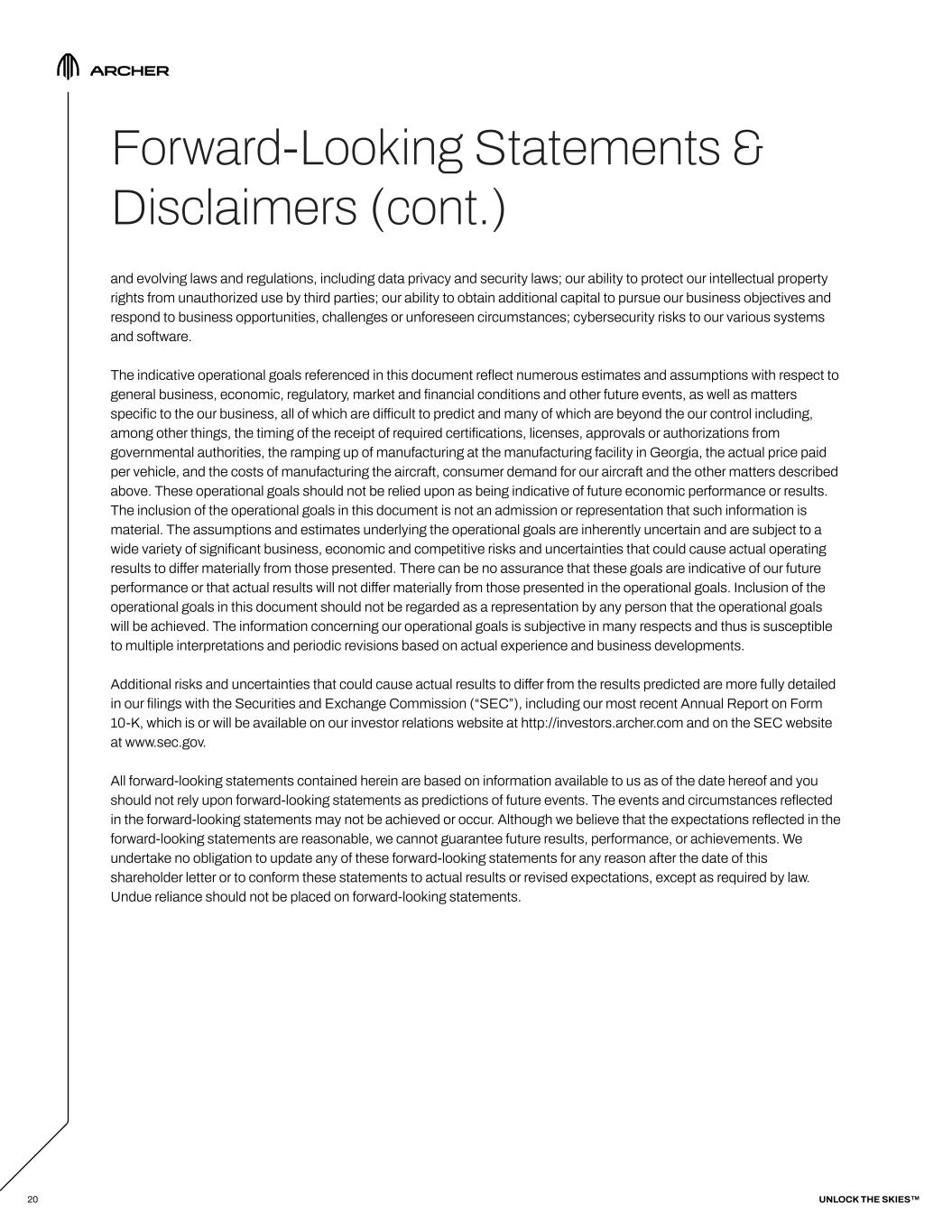 19 Forward-Looking Statements & Disclaimers This shareholder letter includes forward-looking statements. These statements include, but are not limited to, statements regarding our future performance and our market opportunity, including expected financial results for the second quarter of fiscal year 2025, our business strategy and plans, aircraft performance, the design and target specifications of our aircraft, the design of our manufacturing and automation processes, the production timeline, ramp-up and production volume of our manufacturing facilities, the pace at which we intend to design, develop, certify, conduct test flights, manufacture and commercialize our planned eVTOL aircraft, operational goals with respect to the timing of the launch of our commercial operations, the rate of scaling aircraft production and operating margins, the buildout and deployment of our UAM network, our ability to produce aircraft on our anticipated timeline to fulfill order demand, the design, development and implementation of vertiport infrastructure, the development, and projected market size of, the future urban air mobility market, its plans and anticipated benefits with respect to our strategic partnership with Palantir, projected demand for Archer’s aircraft and services, including our “Launch Edition” commercialization program and associated deployment of aircraft, amount and timing of revenue and cash payments, and the expected timeline for the receipt of regulatory certification from the FAA and international regulatory agencies. In addition, this shareholder letter refers to certain signed agreements that are conditioned on the future execution by the parties of additional binding definitive agreements incorporating the terms outlined in such signed agreements, which definitive agreements may not be completed or may contain different terms. Forward-looking statements are based upon various estimates and assumptions, as well as information known to us as of the date hereof, and are subject to risks and uncertainties. Accordingly, actual results could differ materially due to a variety of factors, including: the early stage nature of our business and our past and projected future losses; our ability to design, manufacture and deliver our aircraft; risks associated with indicative orders from certain third parties for our aircraft, which are subject to the satisfaction of certain conditions and/or further negotiation and reaching mutual agreement on certain material terms, and the risk that such parties cancel such orders or never place them; risks associated with being in the early stages of developing our defense program, and our inability to ensure that we will achieve some or any of the expected benefits of the program or that we will be successful in winning a bid to develop aircraft for the U.S. Department of Defense or any other military agency; risks associated with the expansion of our planned lines of business; risks associated with the current and future international expansion of our business and operations; our ability to realize the expected benefits of an autonomous aircraft development program, as well as the cost, timing and results of our development activities relating to autonomous aircraft; our ability to realize operating and financial results forecasts which rely in large part upon assumptions and analyses that we have developed; our ability to effectively market electric air transportation as a substitute for conventional methods of transportation, following receipt of governmental operating authority; our ability to compete effectively in the UAM and eVTOL industries; risks related to the operation of our UAM ecosystem in densely populated metropolitan areas and heavily regulated airports; our ability to obtain any required certifications, licenses, approvals, or authorizations from governmental authorities; our ability to achieve our business milestones, such as commencing the manufacturing of our aircraft and launching products and services, on anticipated timelines; our dependence on suppliers for the parts and components in our aircraft, which are subject to uncertainties that could affect our operating results, including tariffs or other trade restrictions; our ability to ramp up to commercial-scale manufacturing capabilities; regulatory requirements and other obstacles outside of our control that slow market adoption of electric aircraft, such as the inability to obtain and maintain adequate vertiport infrastructure; our ability to attract, integrate, manage, train and retain qualified personnel and key employees; natural disasters, outbreaks and pandemics, economic, social, weather, growth constraints and regulatory conditions or other circumstances affecting metropolitan areas; the potential for losses and adverse publicity stemming from any accidents involving small aircraft, helicopters or charter flights, and in particular from accidents involving electric aircraft or lithium-ion battery cells, or test flights of our prototype eVTOL aircraft; risks associated with indexed price escalation clauses in aircraft contracts, which could subject us to losses if we have cost overruns or if increases in costs exceed the applicable escalation rate; our ability to address a wide variety of extensive UNLOCK THE SKIES™
