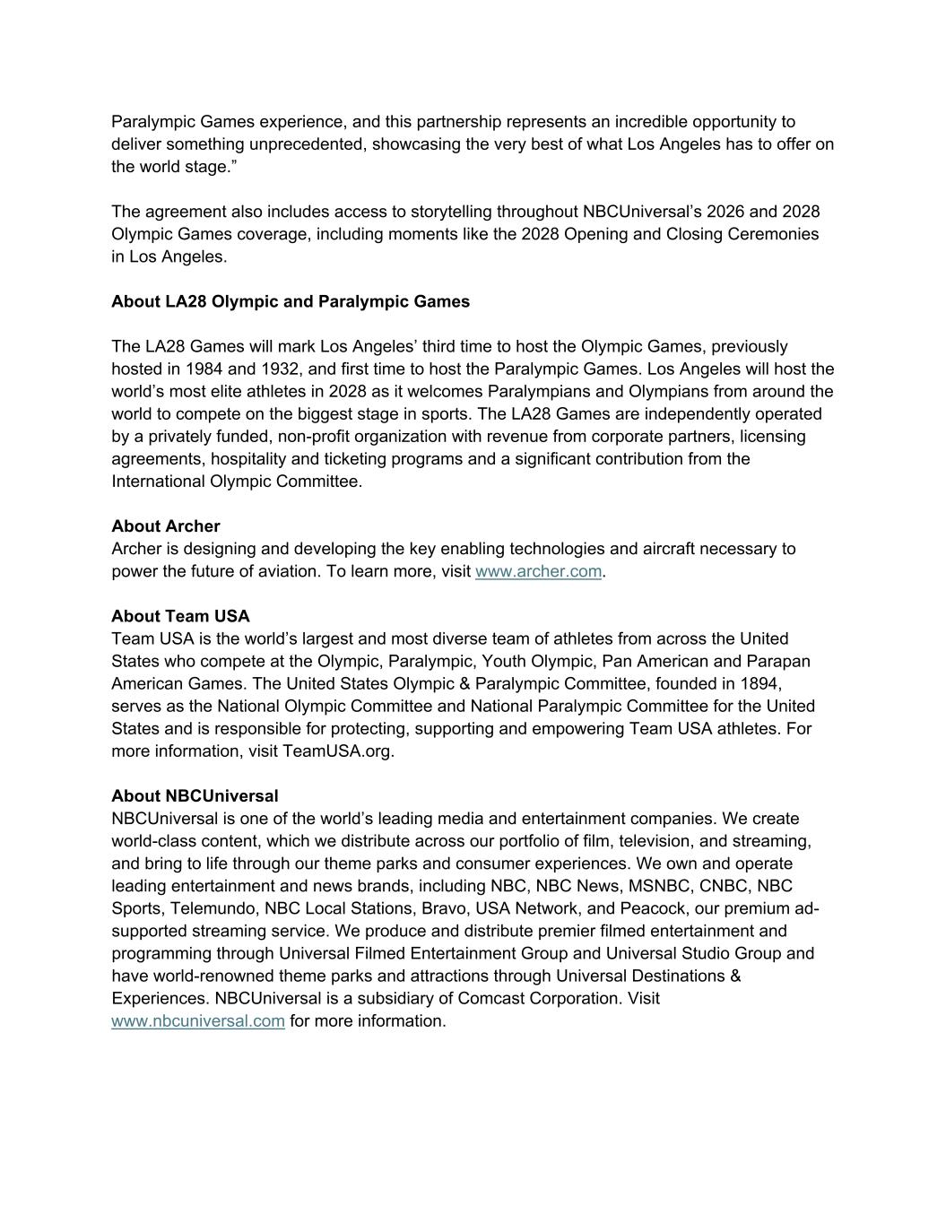 Paralympic Games experience, and this partnership represents an incredible opportunity to deliver something unprecedented, showcasing the very best of what Los Angeles has to offer on the world stage.” The agreement also includes access to storytelling throughout NBCUniversal’s 2026 and 2028 Olympic Games coverage, including moments like the 2028 Opening and Closing Ceremonies in Los Angeles. About LA28 Olympic and Paralympic Games The LA28 Games will mark Los Angeles’ third time to host the Olympic Games, previously hosted in 1984 and 1932, and first time to host the Paralympic Games. Los Angeles will host the world’s most elite athletes in 2028 as it welcomes Paralympians and Olympians from around the world to compete on the biggest stage in sports. The LA28 Games are independently operated by a privately funded, non-profit organization with revenue from corporate partners, licensing agreements, hospitality and ticketing programs and a significant contribution from the International Olympic Committee. About Archer Archer is designing and developing the key enabling technologies and aircraft necessary to power the future of aviation. To learn more, visit www.archer.com. About Team USA Team USA is the world’s largest and most diverse team of athletes from across the United States who compete at the Olympic, Paralympic, Youth Olympic, Pan American and Parapan American Games. The United States Olympic & Paralympic Committee, founded in 1894, serves as the National Olympic Committee and National Paralympic Committee for the United States and is responsible for protecting, supporting and empowering Team USA athletes. For more information, visit TeamUSA.org. About NBCUniversal NBCUniversal is one of the world’s leading media and entertainment companies. We create world-class content, which we distribute across our portfolio of film, television, and streaming, and bring to life through our theme parks and consumer experiences. We own and operate leading entertainment and news brands, including NBC, NBC News, MSNBC, CNBC, NBC Sports, Telemundo, NBC Local Stations, Bravo, USA Network, and Peacock, our premium ad- supported streaming service. We produce and distribute premier filmed entertainment and programming through Universal Filmed Entertainment Group and Universal Studio Group and have world-renowned theme parks and attractions through Universal Destinations & Experiences. NBCUniversal is a subsidiary of Comcast Corporation. Visit www.nbcuniversal.com for more information.