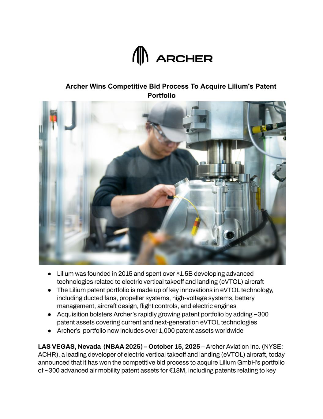 Archer Wins Competitive Bid Process To Acquire Lilium's Patent Portfolio ●​ Lilium was founded in 2015 and spent over $1.5B developing advanced technologies related to electric vertical takeoff and landing (eVTOL) aircraft ●​ The Lilium patent portfolio is made up of key innovations in eVTOL technology, including ducted fans, propeller systems, high-voltage systems, battery management, aircraft design, flight controls, and electric engines ●​ Acquisition bolsters Archer’s rapidly growing patent portfolio by adding ~300 patent assets covering current and next-generation eVTOL technologies ●​ Archer’s portfolio now includes over 1,000 patent assets worldwide LAS VEGAS, Nevada (NBAA 2025) – October 15, 2025 – Archer Aviation Inc. (NYSE: ACHR), a leading developer of electric vertical takeoff and landing (eVTOL) aircraft, today announced that it has won the competitive bid process to acquire Lilium GmbH’s portfolio of ~300 advanced air mobility patent assets for €18M, including patents relating to key