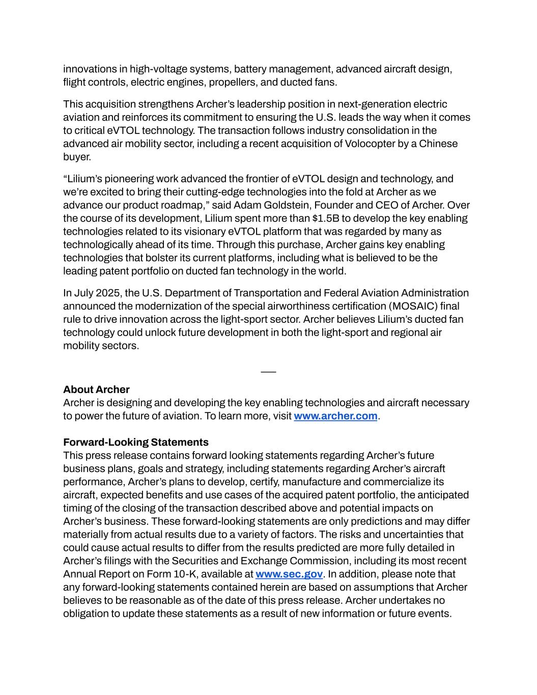 innovations in high-voltage systems, battery management, advanced aircraft design, flight controls, electric engines, propellers, and ducted fans. This acquisition strengthens Archer’s leadership position in next-generation electric aviation and reinforces its commitment to ensuring the U.S. leads the way when it comes to critical eVTOL technology. The transaction follows industry consolidation in the advanced air mobility sector, including a recent acquisition of Volocopter by a Chinese buyer. “Lilium’s pioneering work advanced the frontier of eVTOL design and technology, and we’re excited to bring their cutting-edge technologies into the fold at Archer as we advance our product roadmap,” said Adam Goldstein, Founder and CEO of Archer. Over the course of its development, Lilium spent more than $1.5B to develop the key enabling technologies related to its visionary eVTOL platform that was regarded by many as technologically ahead of its time. Through this purchase, Archer gains key enabling technologies that bolster its current platforms, including what is believed to be the leading patent portfolio on ducted fan technology in the world. In July 2025, the U.S. Department of Transportation and Federal Aviation Administration announced the modernization of the special airworthiness certification (MOSAIC) final rule to drive innovation across the light-sport sector. Archer believes Lilium’s ducted fan technology could unlock future development in both the light-sport and regional air mobility sectors. ___ About Archer Archer is designing and developing the key enabling technologies and aircraft necessary to power the future of aviation. To learn more, visit www.archer.com. Forward-Looking Statements This press release contains forward looking statements regarding Archer’s future business plans, goals and strategy, including statements regarding Archer’s aircraft performance, Archer’s plans to develop, certify, manufacture and commercialize its aircraft, expected benefits and use cases of the acquired patent portfolio, the anticipated timing of the closing of the transaction described above and potential impacts on Archer’s business. These forward-looking statements are only predictions and may differ materially from actual results due to a variety of factors. The risks and uncertainties that could cause actual results to differ from the results predicted are more fully detailed in Archer’s filings with the Securities and Exchange Commission, including its most recent Annual Report on Form 10-K, available at www.sec.gov. In addition, please note that any forward-looking statements contained herein are based on assumptions that Archer believes to be reasonable as of the date of this press release. Archer undertakes no obligation to update these statements as a result of new information or future events.