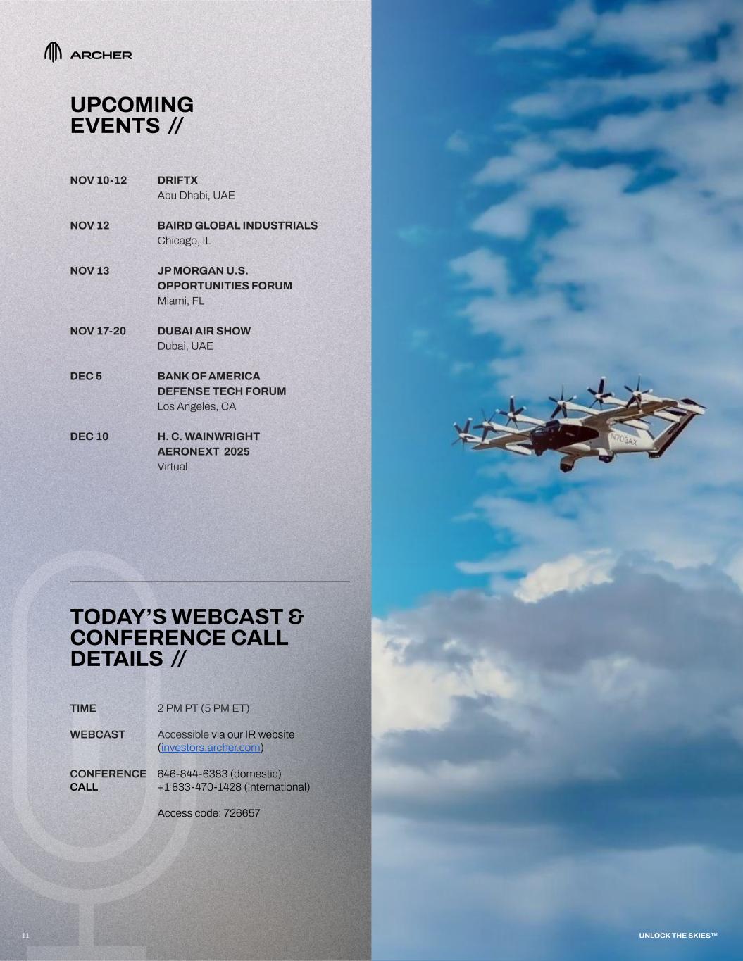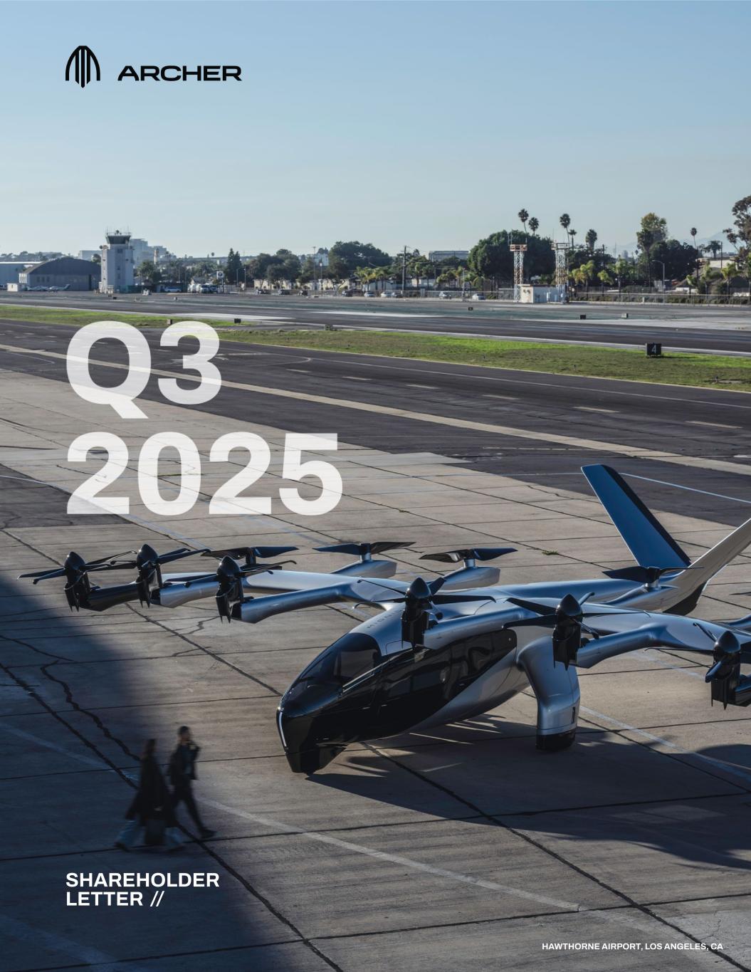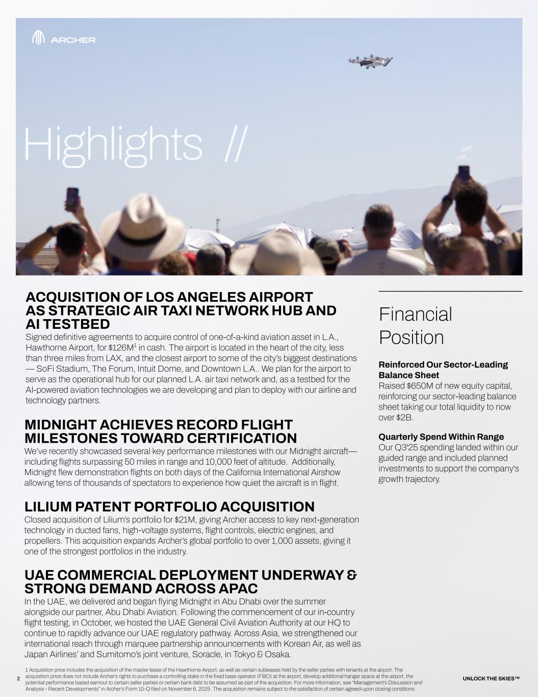 Financial Position Reinforced Our Sector-Leading Balance Sheet Raised $650M of new equity capital, reinforcing our sector-leading balance sheet taking our total liquidity to now over $2B. Quarterly Spend Within Range Our Q3'25 spending landed within our guided range and included planned investments to support the company's growth trajectory. 2 UNLOCK THE SKIES™ ACQUISITION OF LOS ANGELES AIRPORT AS STRATEGIC AIR TAXI NETWORK HUB AND AI TESTBED Signed definitive agreements to acquire control of one-of-a-kind aviation asset in L.A., Hawthorne Airport, for $126M1 in cash. The airport is located in the heart of the city, less than three miles from LAX, and the closest airport to some of the city’s biggest destinations — SoFi Stadium, The Forum, Intuit Dome, and Downtown L.A.. We plan for the airport to serve as the operational hub for our planned L.A. air taxi network and, as a testbed for the AI-powered aviation technologies we are developing and plan to deploy with our airline and technology partners. MIDNIGHT ACHIEVES RECORD FLIGHT MILESTONES TOWARD CERTIFICATION We’ve recently showcased several key performance milestones with our Midnight aircraft— including flights surpassing 50 miles in range and 10,000 feet of altitude. Additionally, Midnight flew demonstration flights on both days of the California International Airshow allowing tens of thousands of spectators to experience how quiet the aircraft is in flight. UAE COMMERCIAL DEPLOYMENT UNDERWAY & STRONG DEMAND ACROSS APAC In the UAE, we delivered and began flying Midnight in Abu Dhabi over the summer alongside our partner, Abu Dhabi Aviation. Following the commencement of our in-country flight testing, in October, we hosted the UAE General Civil Aviation Authority at our HQ to continue to rapidly advance our UAE regulatory pathway. Across Asia, we strengthened our international reach through marquee partnership announcements with Korean Air, as well as Japan Airlines’ and Sumitomo’s joint venture, Soracle, in Tokyo & Osaka. LILIUM PATENT PORTFOLIO ACQUISITION Closed acquisition of Lilium’s portfolio for $21M, giving Archer access to key next-generation technology in ducted fans, high-voltage systems, flight controls, electric engines, and propellers. This acquisition expands Archer’s global portfolio to over 1,000 assets, giving it one of the strongest portfolios in the industry. 1 Acquisition price includes the acquisition of the master lease of the Hawthorne Airport, as well as certain subleases held by the seller parties with tenants at the airport. The acquisition price does not include Archer’s rights to purchase a controlling stake in the fixed base operator (FBO) at the airport, develop additional hangar space at the airport, the potential performance based earnout to certain seller parties or certain bank debt to be assumed as part of the acquisition. For more information, see “Management’s Discussion and Analysis - Recent Developments” in Archer’s Form 10-Q filed on November 6, 2025. The acquisition remains subject to the satisfaction of certain agreed-upon closing conditions.