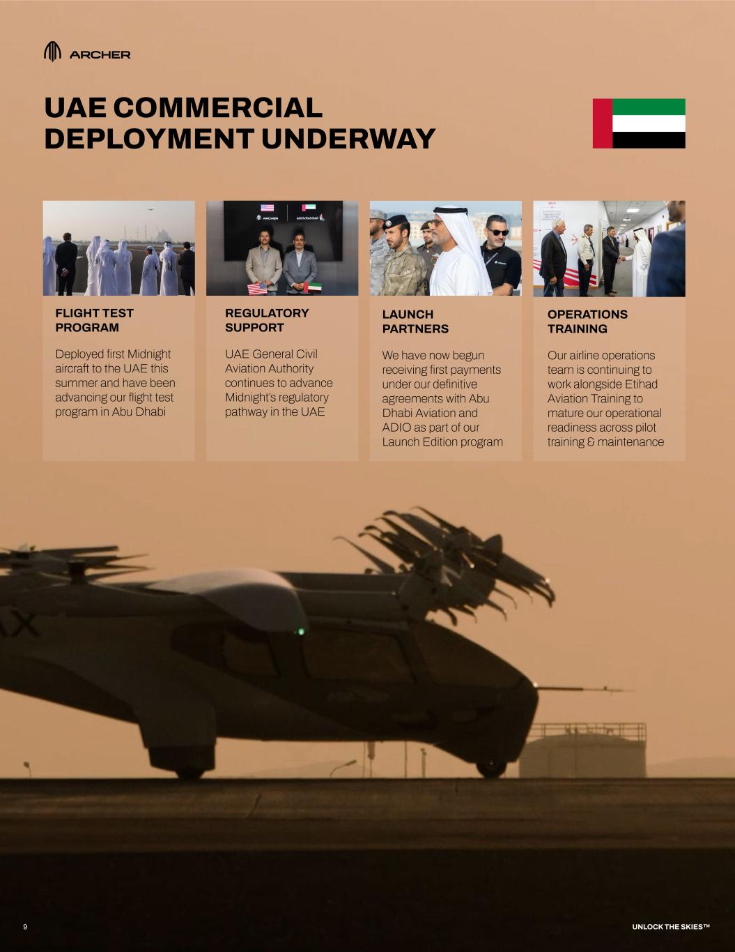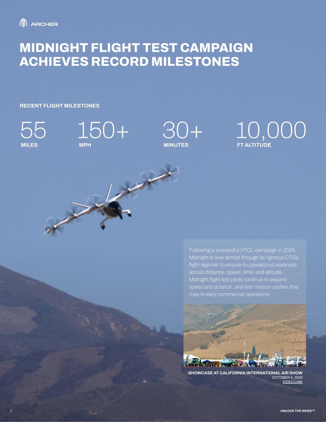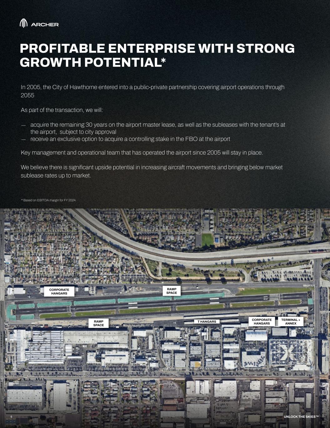 Financial Position Reinforced Our Sector-Leading Balance Sheet Raised $650M of new equity capital, reinforcing our sector-leading balance sheet taking our total liquidity to now over $2B. Quarterly Spend Within Range Our Q3'25 spending landed within our guided range and included planned investments to support the company's growth trajectory. 2 UNLOCK THE SKIES™ ACQUISITION OF LOS ANGELES AIRPORT AS STRATEGIC AIR TAXI NETWORK HUB AND AI TESTBED Signed definitive agreements to acquire control of one-of-a-kind aviation asset in L.A., Hawthorne Airport, for $126M1 in cash. The airport is located in the heart of the city, less than three miles from LAX, and the closest airport to some of the city’s biggest destinations — SoFi Stadium, The Forum, Intuit Dome, and Downtown L.A.. We plan for the airport to serve as the operational hub for our planned L.A. air taxi network and, as a testbed for the AI-powered aviation technologies we are developing and plan to deploy with our airline and technology partners. MIDNIGHT ACHIEVES RECORD FLIGHT MILESTONES TOWARD CERTIFICATION We’ve recently showcased several key performance milestones with our Midnight aircraft— including flights surpassing 50 miles in range and 10,000 feet of altitude. Additionally, Midnight flew demonstration flights on both days of the California International Airshow allowing tens of thousands of spectators to experience how quiet the aircraft is in flight. UAE COMMERCIAL DEPLOYMENT UNDERWAY & STRONG DEMAND ACROSS APAC In the UAE, we delivered and began flying Midnight in Abu Dhabi over the summer alongside our partner, Abu Dhabi Aviation. Following the commencement of our in-country flight testing, in October, we hosted the UAE General Civil Aviation Authority at our HQ to continue to rapidly advance our UAE regulatory pathway. Across Asia, we strengthened our international reach through marquee partnership announcements with Korean Air, as well as Japan Airlines’ and Sumitomo’s joint venture, Soracle, in Tokyo & Osaka. LILIUM PATENT PORTFOLIO ACQUISITION Closed acquisition of Lilium’s portfolio for $21M, giving Archer access to key next-generation technology in ducted fans, high-voltage systems, flight controls, electric engines, and propellers. This acquisition expands Archer’s global portfolio to over 1,000 assets, giving it one of the strongest portfolios in the industry. 1 Acquisition price includes the acquisition of the master lease of the Hawthorne Airport, as well as certain subleases held by the seller parties with tenants at the airport. The acquisition price does not include Archer’s rights to purchase a controlling stake in the fixed base operator (FBO) at the airport, develop additional hangar space at the airport, the potential performance based earnout to certain seller parties or certain bank debt to be assumed as part of the acquisition. For more information, see “Management’s Discussion and Analysis - Recent Developments” in Archer’s Form 10-Q filed on November 6, 2025. The acquisition remains subject to the satisfaction of certain agreed-upon closing conditions.
