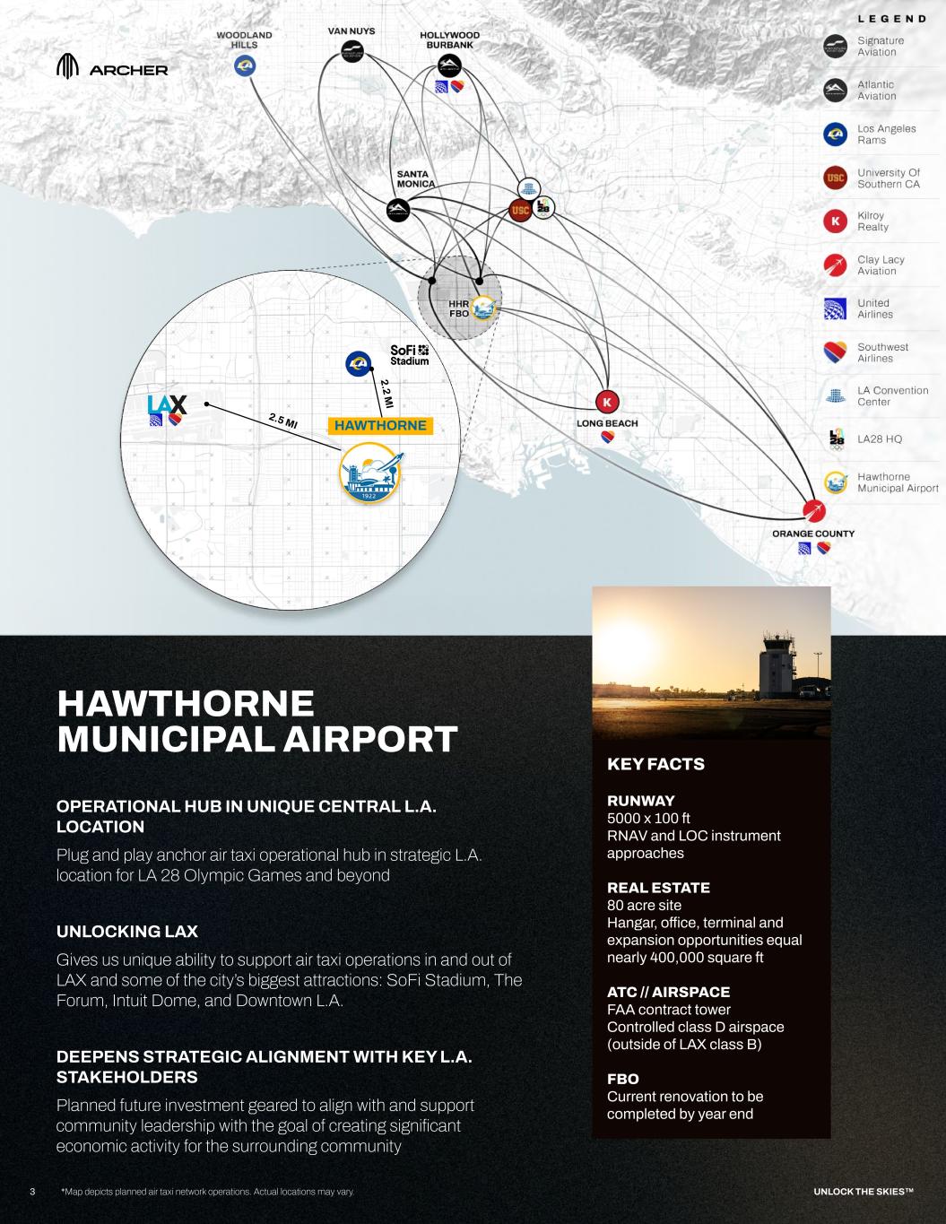 2.5 MI HAWTHORNE 2.2 M I 3 UNLOCK THE SKIES™ HAWTHORNE MUNICIPAL AIRPORT OPERATIONAL HUB IN UNIQUE CENTRAL L.A. LOCATION Plug and play anchor air taxi operational hub in strategic L.A. location for LA 28 Olympic Games and beyond UNLOCKING LAX Gives us unique ability to support air taxi operations in and out of LAX and some of the city’s biggest attractions: SoFi Stadium, The Forum, Intuit Dome, and Downtown L.A. DEEPENS STRATEGIC ALIGNMENT WITH KEY L.A. STAKEHOLDERS Planned future investment geared to align with and support community leadership with the goal of creating significant economic activity for the surrounding community *Map depicts planned air taxi network operations. Actual locations may vary. KEY FACTS RUNWAY 5000 x 100 ft RNAV and LOC instrument approaches REAL ESTATE 80 acre site Hangar, office, terminal and expansion opportunities equal nearly 400,000 square ft ATC // AIRSPACE FAA contract tower Controlled class D airspace (outside of LAX class B) FBO Current renovation to be completed by year end