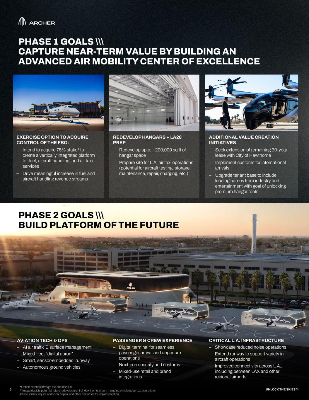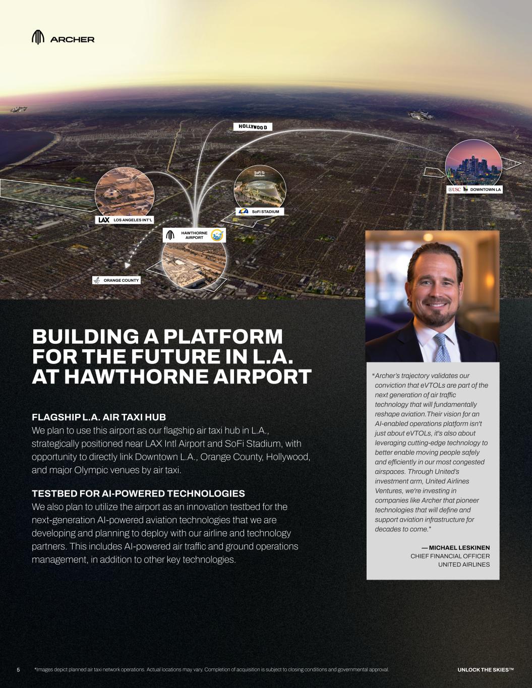 BUILDING A PLATFORM FOR THE FUTURE IN L.A. AT HAWTHORNE AIRPORT 5 UNLOCK THE SKIES™ FLAGSHIP L.A. AIR TAXI HUB We plan to use this airport as our flagship air taxi hub in L.A., strategically positioned near LAX Intl Airport and SoFi Stadium, with opportunity to directly link Downtown L.A., Orange County, Hollywood, and major Olympic venues by air taxi. TESTBED FOR AI-POWERED TECHNOLOGIES We also plan to utilize the airport as an innovation testbed for the next-generation AI-powered aviation technologies that we are developing and planning to deploy with our airline and technology partners. This includes AI-powered air traffic and ground operations management, in addition to other key technologies. *Images depict planned air taxi network operations. Actual locations may vary. Completion of acquisition is subject to closing conditions and governmental approval. SoFi STADIUM ORANGE COUNTY LOS ANGELES INT’L DOWNTOWN LA HAWTHORNE AIRPORT “Archer’s trajectory validates our conviction that eVTOLs are part of the next generation of air traffic technology that will fundamentally reshape aviation.Their vision for an AI-enabled operations platform isn't just about eVTOLs, it's also about leveraging cutting-edge technology to better enable moving people safely and efficiently in our most congested airspaces. Through United’s investment arm, United Airlines Ventures, we're investing in companies like Archer that pioneer technologies that will define and support aviation infrastructure for decades to come.” — MICHAEL LESKINEN CHIEF FINANCIAL OFFICER UNITED AIRLINES