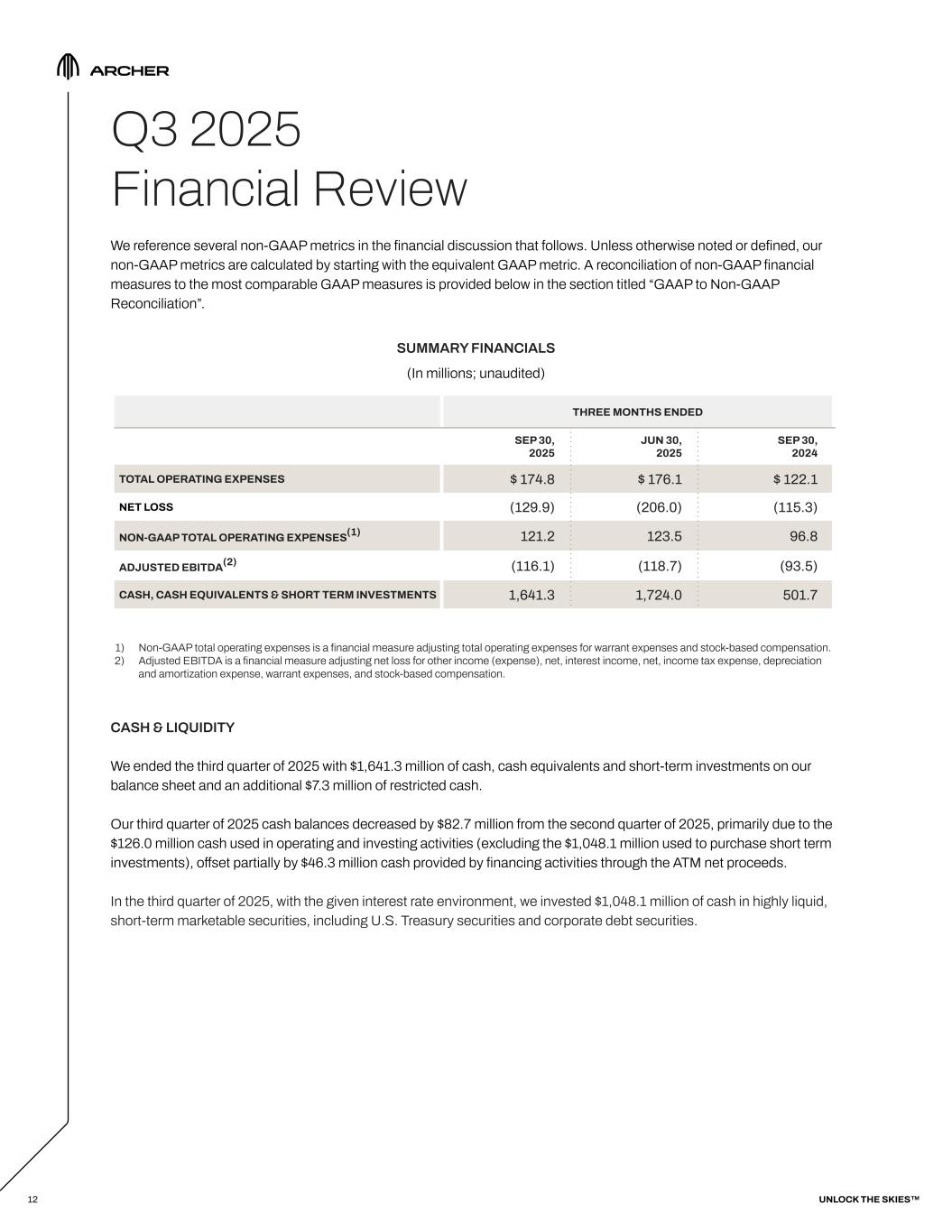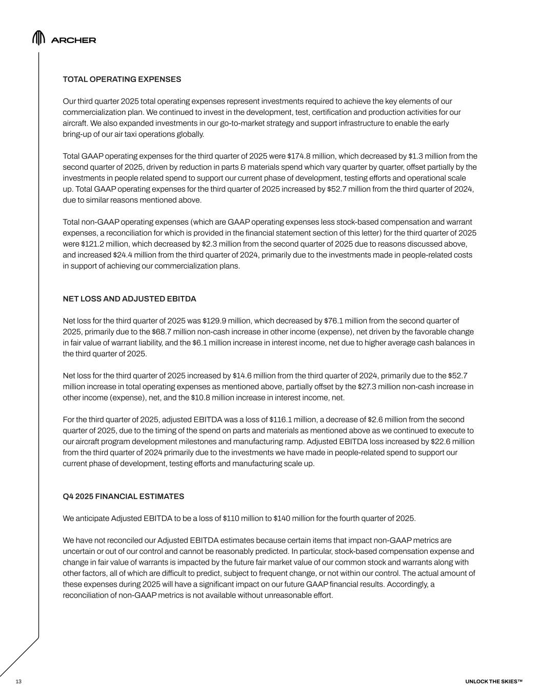 13 TOTAL OPERATING EXPENSES Our third quarter 2025 total operating expenses represent investments required to achieve the key elements of our commercialization plan. We continued to invest in the development, test, certification and production activities for our aircraft. We also expanded investments in our go-to-market strategy and support infrastructure to enable the early bring-up of our air taxi operations globally. Total GAAP operating expenses for the third quarter of 2025 were $174.8 million, which decreased by $1.3 million from the second quarter of 2025, driven by reduction in parts & materials spend which vary quarter by quarter, offset partially by the investments in people related spend to support our current phase of development, testing efforts and operational scale up. Total GAAP operating expenses for the third quarter of 2025 increased by $52.7 million from the third quarter of 2024, due to similar reasons mentioned above. Total non-GAAP operating expenses (which are GAAP operating expenses less stock-based compensation and warrant expenses, a reconciliation for which is provided in the financial statement section of this letter) for the third quarter of 2025 were $121.2 million, which decreased by $2.3 million from the second quarter of 2025 due to reasons discussed above, and increased $24.4 million from the third quarter of 2024, primarily due to the investments made in people-related costs in support of achieving our commercialization plans. NET LOSS AND ADJUSTED EBITDA Net loss for the third quarter of 2025 was $129.9 million, which decreased by $76.1 million from the second quarter of 2025, primarily due to the $68.7 million non-cash increase in other income (expense), net driven by the favorable change in fair value of warrant liability, and the $6.1 million increase in interest income, net due to higher average cash balances in the third quarter of 2025. Net loss for the third quarter of 2025 increased by $14.6 million from the third quarter of 2024, primarily due to the $52.7 million increase in total operating expenses as mentioned above, partially offset by the $27.3 million non-cash increase in other income (expense), net, and the $10.8 million increase in interest income, net. For the third quarter of 2025, adjusted EBITDA was a loss of $116.1 million, a decrease of $2.6 million from the second quarter of 2025, due to the timing of the spend on parts and materials as mentioned above as we continued to execute to our aircraft program development milestones and manufacturing ramp. Adjusted EBITDA loss increased by $22.6 million from the third quarter of 2024 primarily due to the investments we have made in people-related spend to support our current phase of development, testing efforts and manufacturing scale up. Q4 2025 FINANCIAL ESTIMATES We anticipate Adjusted EBITDA to be a loss of $110 million to $140 million for the fourth quarter of 2025. We have not reconciled our Adjusted EBITDA estimates because certain items that impact non-GAAP metrics are uncertain or out of our control and cannot be reasonably predicted. In particular, stock-based compensation expense and change in fair value of warrants is impacted by the future fair market value of our common stock and warrants along with other factors, all of which are difficult to predict, subject to frequent change, or not within our control. The actual amount of these expenses during 2025 will have a significant impact on our future GAAP financial results. Accordingly, a reconciliation of non-GAAP metrics is not available without unreasonable effort. UNLOCK THE SKIES™
