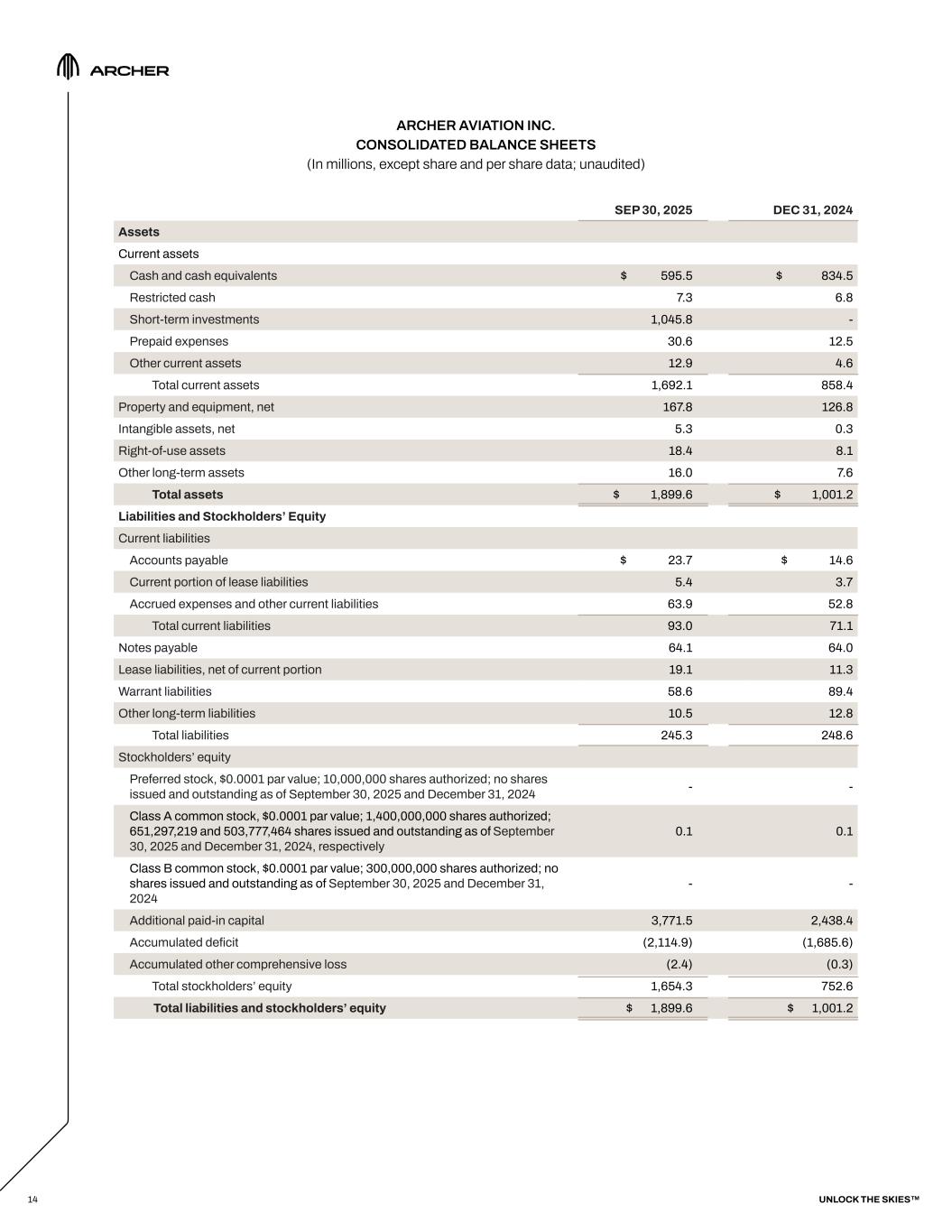ARCHER AVIATION INC. CONSOLIDATED BALANCE SHEETS (In millions, except share and per share data; unaudited) 14 SEP 30, 2025 DEC 31, 2024 Assets Current assets Cash and cash equivalents $ 595.5 $ 834.5 Restricted cash 7.3 6.8 Short-term investments 1,045.8 - Prepaid expenses 30.6 12.5 Other current assets 12.9 4.6 Total current assets 1,692.1 858.4 Property and equipment, net 167.8 126.8 Intangible assets, net 5.3 0.3 Right-of-use assets 18.4 8.1 Other long-term assets 16.0 7.6 Total assets $ 1,899.6 $ 1,001.2 Liabilities and Stockholders’ Equity Current liabilities Accounts payable $ 23.7 $ 14.6 Current portion of lease liabilities 5.4 3.7 Accrued expenses and other current liabilities 63.9 52.8 Total current liabilities 93.0 71.1 Notes payable 64.1 64.0 Lease liabilities, net of current portion 19.1 11.3 Warrant liabilities 58.6 89.4 Other long-term liabilities 10.5 12.8 Total liabilities 245.3 248.6 Stockholders’ equity Preferred stock, $0.0001 par value; 10,000,000 shares authorized; no shares issued and outstanding as of September 30, 2025 and December 31, 2024 - - Class A common stock, $0.0001 par value; 1,400,000,000 shares authorized; 651,297,219 and 503,777,464 shares issued and outstanding as of September 30, 2025 and December 31, 2024, respectively 0.1 0.1 Class B common stock, $0.0001 par value; 300,000,000 shares authorized; no shares issued and outstanding as of September 30, 2025 and December 31, 2024 - - Additional paid-in capital 3,771.5 2,438.4 Accumulated deficit (2,114.9) (1,685.6) Accumulated other comprehensive loss (2.4) (0.3) Total stockholders’ equity 1,654.3 752.6 Total liabilities and stockholders’ equity $ 1,899.6 $ 1,001.2 UNLOCK THE SKIES™