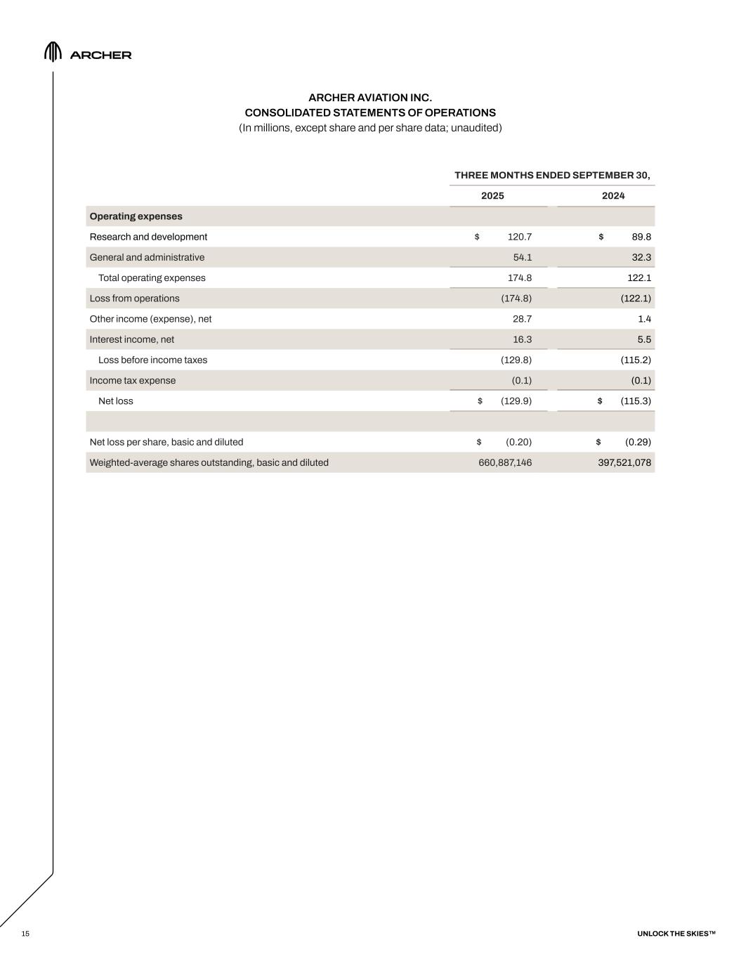 ARCHER AVIATION INC. CONSOLIDATED STATEMENTS OF OPERATIONS (In millions, except share and per share data; unaudited) 15 THREE MONTHS ENDED SEPTEMBER 30, 2025 2024 Operating expenses Research and development $ 120.7 $ 89.8 General and administrative 54.1 32.3 Total operating expenses 174.8 122.1 Loss from operations (174.8) (122.1) Other income (expense), net 28.7 1.4 Interest income, net 16.3 5.5 Loss before income taxes (129.8) (115.2) Income tax expense (0.1) (0.1) Net loss $ (129.9) $ (115.3) Net loss per share, basic and diluted $ (0.20) $ (0.29) Weighted-average shares outstanding, basic and diluted 660,887,146 397,521,078 UNLOCK THE SKIES™