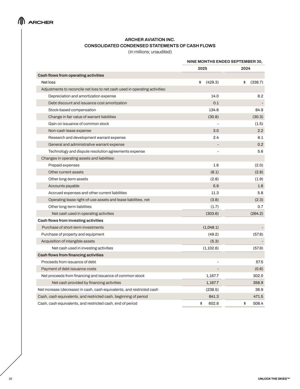 ARCHER AVIATION INC. CONSOLIDATED CONDENSED STATEMENTS OF CASH FLOWS (In millions; unaudited) 16 NINE MONTHS ENDED SEPTEMBER 30, 2025 2024 Cash flows from operating activities Net loss $ (429.3) $ (338.7) Adjustments to reconcile net loss to net cash used in operating activities: Depreciation and amortization expense 14.0 8.2 Debt discount and issuance cost amortization 0.1 - Stock-based compensation 134.6 84.9 Change in fair value of warrant liabilities (30.8) (30.3) Gain on issuance of common stock - (1.5) Non-cash lease expense 3.0 2.2 Research and development warrant expense 2.4 6.1 General and administrative warrant expense - 0.2 Technology and dispute resolution agreements expense - 5.6 Changes in operating assets and liabilities: Prepaid expenses 1.6 (2.0) Other current assets (8.1) (2.8) Other long-term assets (2.8) (1.9) Accounts payable 5.9 1.6 Accrued expenses and other current liabilities 11.3 5.8 Operating lease right-of-use assets and lease liabilities, net (3.8) (2.3) Other long-term liabilities (1.7) 0.7 Net cash used in operating activities (303.6) (264.2) Cash flows from investing activities Purchase of short-term investments (1,048.1) - Purchase of property and equipment (49.2) (57.8) Acquisition of intangible assets (5.3) - Net cash used in investing activities (1,102.6) (57.8) Cash flows from financing activities Proceeds from issuance of debt - 57.5 Payment of debt issuance costs - (0.6) Net proceeds from financing and issuance of common stock 1,167.7 302.0 Net cash provided by financing activities 1,167.7 358.9 Net increase (decrease) in cash, cash equivalents, and restricted cash (238.5) 36.9 Cash, cash equivalents, and restricted cash, beginning of period 841.3 471.5 Cash, cash equivalents, and restricted cash, end of period $ 602.8 $ 508.4 UNLOCK THE SKIES™
