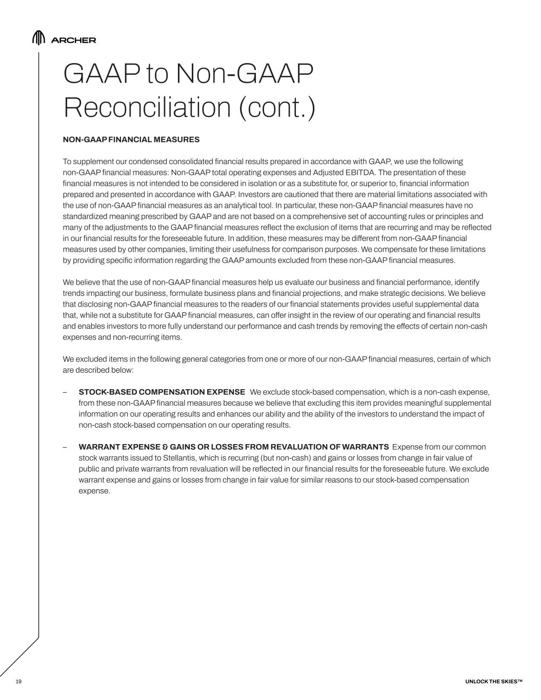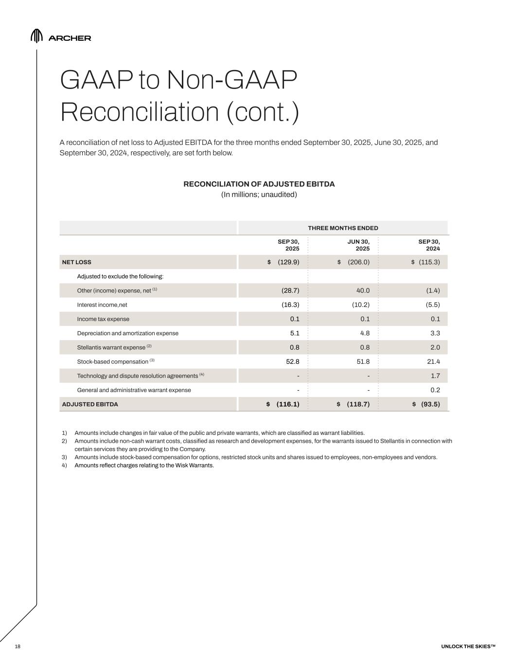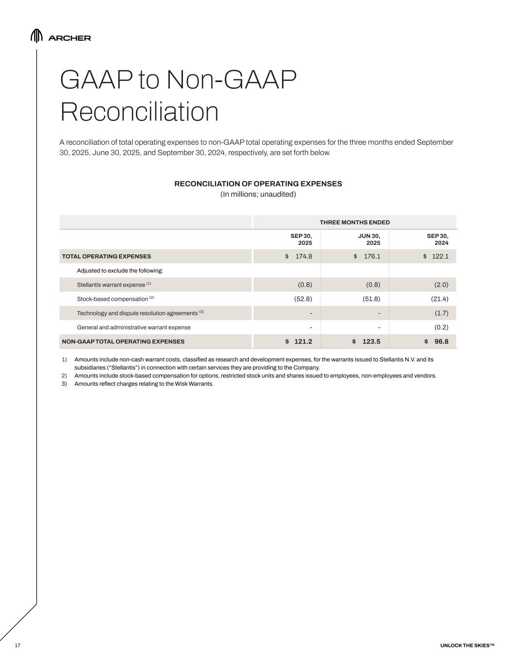GAAP to Non-GAAP Reconciliation A reconciliation of total operating expenses to non-GAAP total operating expenses for the three months ended September 30, 2025, June 30, 2025, and September 30, 2024, respectively, are set forth below. RECONCILIATION OF OPERATING EXPENSES (In millions; unaudited) 1) Amounts include non-cash warrant costs, classified as research and development expenses, for the warrants issued to Stellantis N.V. and its subsidiaries (“Stellantis”) in connection with certain services they are providing to the Company. 2) Amounts include stock-based compensation for options, restricted stock units and shares issued to employees, non-employees and vendors. 3) Amounts reflect charges relating to the Wisk Warrants. 17 THREE MONTHS ENDED SEP 30, 2025 JUN 30, 2025 SEP 30, 2024 TOTAL OPERATING EXPENSES $ 174.8 $ 176.1 $ 122.1 Adjusted to exclude the following: Stellantis warrant expense (1) (0.8) (0.8) (2.0) Stock-based compensation (2) (52.8) (51.8) (21.4) Technology and dispute resolution agreements (3) - - (1.7) General and administrative warrant expense - - (0.2) NON-GAAP TOTAL OPERATING EXPENSES $ 121.2 $ 123.5 $ 96.8 UNLOCK THE SKIES™