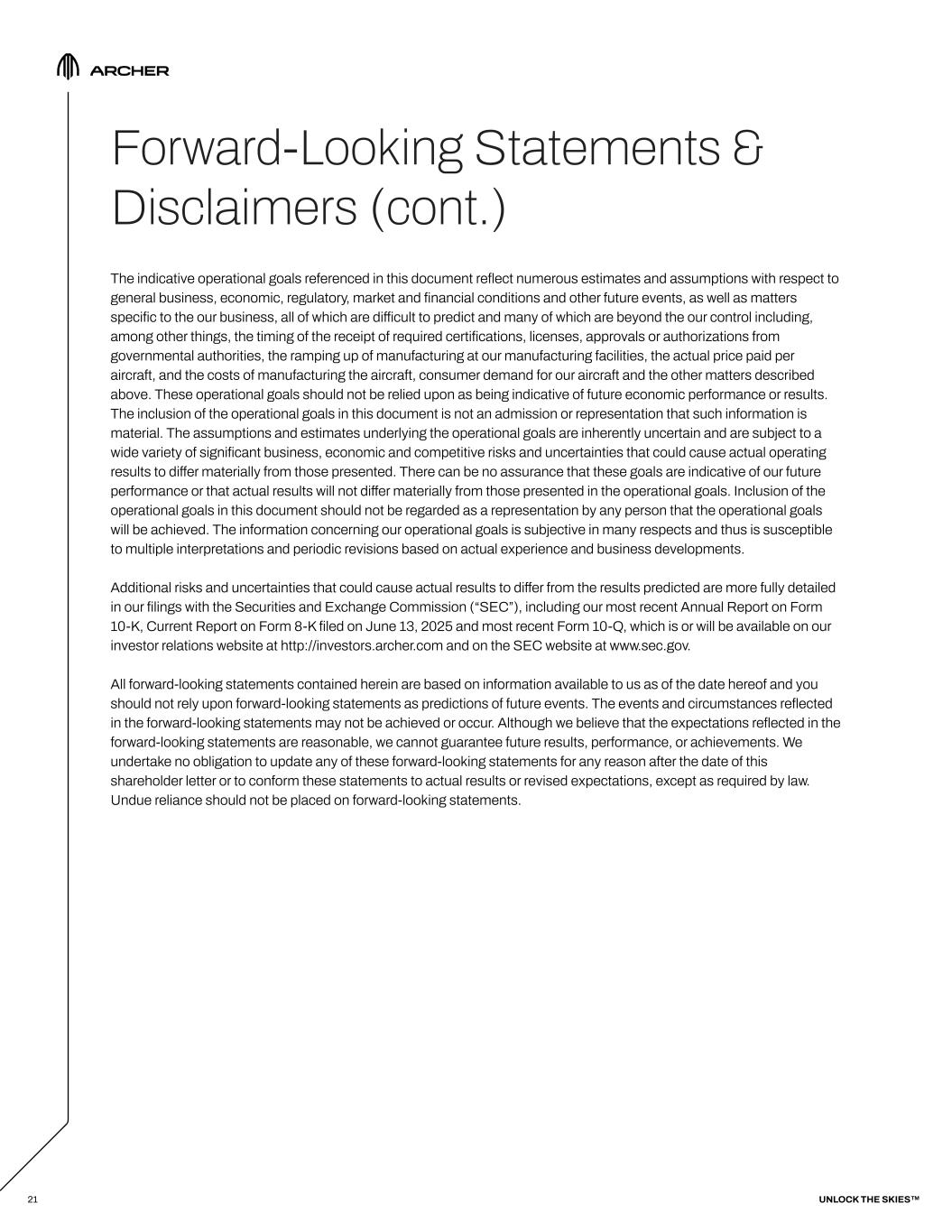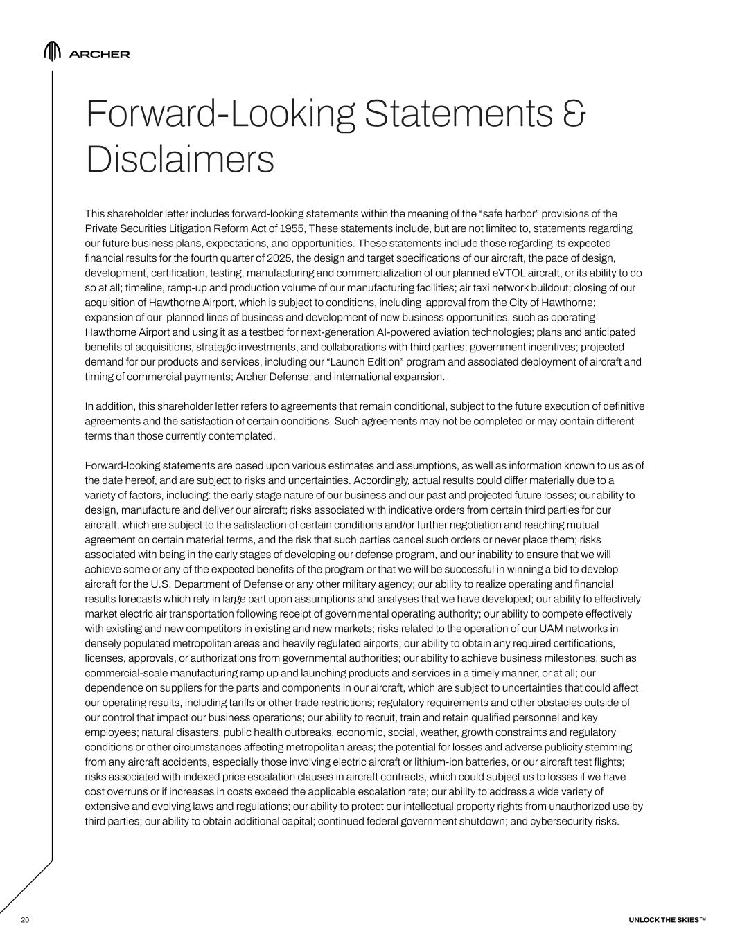 20 Forward-Looking Statements & Disclaimers This shareholder letter includes forward-looking statements within the meaning of the “safe harbor” provisions of the Private Securities Litigation Reform Act of 1955, These statements include, but are not limited to, statements regarding our future business plans, expectations, and opportunities. These statements include those regarding its expected financial results for the fourth quarter of 2025, the design and target specifications of our aircraft, the pace of design, development, certification, testing, manufacturing and commercialization of our planned eVTOL aircraft, or its ability to do so at all; timeline, ramp-up and production volume of our manufacturing facilities; air taxi network buildout; closing of our acquisition of Hawthorne Airport, which is subject to conditions, including approval from the City of Hawthorne; expansion of our planned lines of business and development of new business opportunities, such as operating Hawthorne Airport and using it as a testbed for next-generation AI-powered aviation technologies; plans and anticipated benefits of acquisitions, strategic investments, and collaborations with third parties; government incentives; projected demand for our products and services, including our “Launch Edition” program and associated deployment of aircraft and timing of commercial payments; Archer Defense; and international expansion. In addition, this shareholder letter refers to agreements that remain conditional, subject to the future execution of definitive agreements and the satisfaction of certain conditions. Such agreements may not be completed or may contain different terms than those currently contemplated. Forward-looking statements are based upon various estimates and assumptions, as well as information known to us as of the date hereof, and are subject to risks and uncertainties. Accordingly, actual results could differ materially due to a variety of factors, including: the early stage nature of our business and our past and projected future losses; our ability to design, manufacture and deliver our aircraft; risks associated with indicative orders from certain third parties for our aircraft, which are subject to the satisfaction of certain conditions and/or further negotiation and reaching mutual agreement on certain material terms, and the risk that such parties cancel such orders or never place them; risks associated with being in the early stages of developing our defense program, and our inability to ensure that we will achieve some or any of the expected benefits of the program or that we will be successful in winning a bid to develop aircraft for the U.S. Department of Defense or any other military agency; our ability to realize operating and financial results forecasts which rely in large part upon assumptions and analyses that we have developed; our ability to effectively market electric air transportation following receipt of governmental operating authority; our ability to compete effectively with existing and new competitors in existing and new markets; risks related to the operation of our UAM networks in densely populated metropolitan areas and heavily regulated airports; our ability to obtain any required certifications, licenses, approvals, or authorizations from governmental authorities; our ability to achieve business milestones, such as commercial-scale manufacturing ramp up and launching products and services in a timely manner, or at all; our dependence on suppliers for the parts and components in our aircraft, which are subject to uncertainties that could affect our operating results, including tariffs or other trade restrictions; regulatory requirements and other obstacles outside of our control that impact our business operations; our ability to recruit, train and retain qualified personnel and key employees; natural disasters, public health outbreaks, economic, social, weather, growth constraints and regulatory conditions or other circumstances affecting metropolitan areas; the potential for losses and adverse publicity stemming from any aircraft accidents, especially those involving electric aircraft or lithium-ion batteries, or our aircraft test flights; risks associated with indexed price escalation clauses in aircraft contracts, which could subject us to losses if we have cost overruns or if increases in costs exceed the applicable escalation rate; our ability to address a wide variety of extensive and evolving laws and regulations; our ability to protect our intellectual property rights from unauthorized use by third parties; our ability to obtain additional capital; continued federal government shutdown; and cybersecurity risks. UNLOCK THE SKIES™