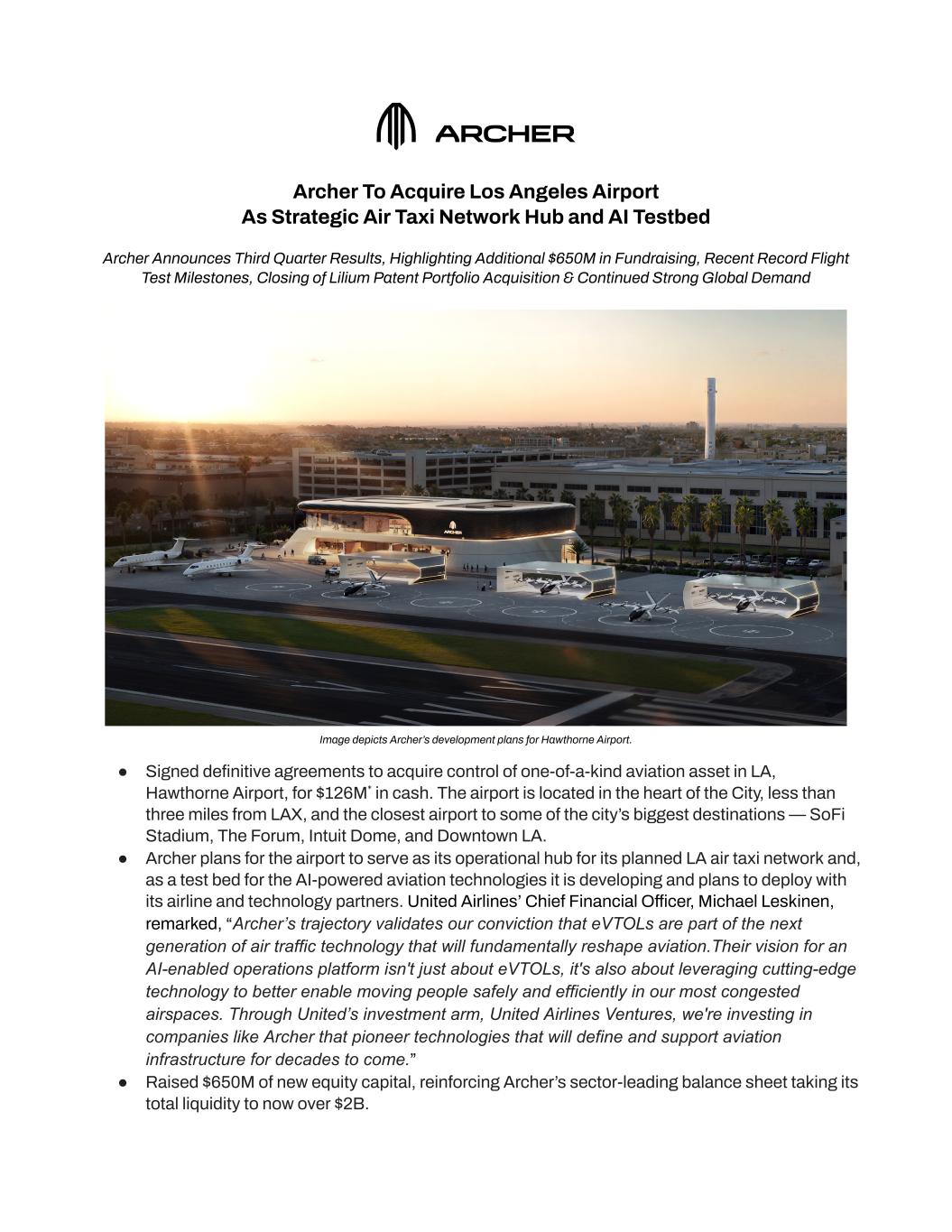 Archer To Acquire Los Angeles Airport As Strategic Air Taxi Network Hub and AI Testbed Archer Announces Third Quarter Results, Highlighting Additional $650M in Fundraising, Recent Record Flight Test Milestones, Closing of Lilium Patent Portfolio Acquisition & Continued Strong Global Demand Image depicts Archer’s development plans for Hawthorne Airport. ●​ Signed definitive agreements to acquire control of one-of-a-kind aviation asset in LA, Hawthorne Airport, for $126M* in cash. The airport is located in the heart of the City, less than three miles from LAX, and the closest airport to some of the city’s biggest destinations — SoFi Stadium, The Forum, Intuit Dome, and Downtown LA. ●​ Archer plans for the airport to serve as its operational hub for its planned LA air taxi network and, as a test bed for the AI-powered aviation technologies it is developing and plans to deploy with its airline and technology partners. United Airlines’ Chief Financial Officer, Michael Leskinen, remarked, “Archer’s trajectory validates our conviction that eVTOLs are part of the next generation of air traffic technology that will fundamentally reshape aviation.Their vision for an AI-enabled operations platform isn't just about eVTOLs, it's also about leveraging cutting-edge technology to better enable moving people safely and efficiently in our most congested airspaces. Through United’s investment arm, United Airlines Ventures, we're investing in companies like Archer that pioneer technologies that will define and support aviation infrastructure for decades to come.” ●​ Raised $650M of new equity capital, reinforcing Archer’s sector-leading balance sheet taking its total liquidity to now over $2B.