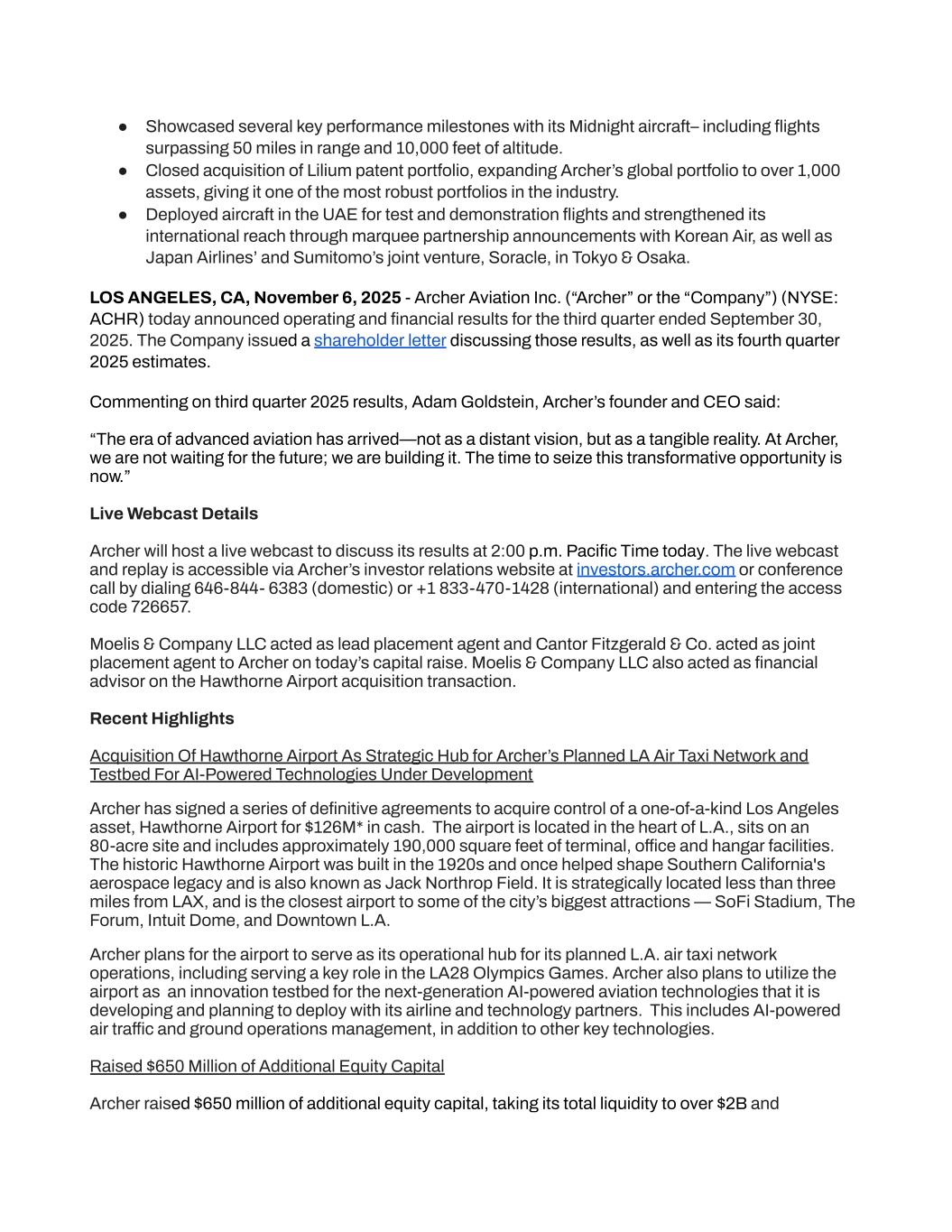 ●​ Showcased several key performance milestones with its Midnight aircraft– including flights surpassing 50 miles in range and 10,000 feet of altitude. ●​ Closed acquisition of Lilium patent portfolio, expanding Archer’s global portfolio to over 1,000 assets, giving it one of the most robust portfolios in the industry. ●​ Deployed aircraft in the UAE for test and demonstration flights and strengthened its international reach through marquee partnership announcements with Korean Air, as well as Japan Airlines’ and Sumitomo’s joint venture, Soracle, in Tokyo & Osaka. LOS ANGELES, CA, November 6, 2025 - Archer Aviation Inc. (“Archer” or the “Company”) (NYSE: ACHR) today announced operating and financial results for the third quarter ended September 30, 2025. The Company issued a shareholder letter discussing those results, as well as its fourth quarter 2025 estimates. Commenting on third quarter 2025 results, Adam Goldstein, Archer’s founder and CEO said: “The era of advanced aviation has arrived—not as a distant vision, but as a tangible reality. At Archer, we are not waiting for the future; we are building it. The time to seize this transformative opportunity is now.” Live Webcast Details Archer will host a live webcast to discuss its results at 2:00 p.m. Pacific Time today. The live webcast and replay is accessible via Archer’s investor relations website at investors.archer.com or conference call by dialing 646-844- 6383 (domestic) or +1 833-470-1428 (international) and entering the access code 726657. Moelis & Company LLC acted as lead placement agent and Cantor Fitzgerald & Co. acted as joint placement agent to Archer on today’s capital raise. Moelis & Company LLC also acted as financial advisor on the Hawthorne Airport acquisition transaction. Recent Highlights Acquisition Of Hawthorne Airport As Strategic Hub for Archer’s Planned LA Air Taxi Network and Testbed For AI-Powered Technologies Under Development Archer has signed a series of definitive agreements to acquire control of a one-of-a-kind Los Angeles asset, Hawthorne Airport for $126M* in cash. The airport is located in the heart of L.A., sits on an 80-acre site and includes approximately 190,000 square feet of terminal, office and hangar facilities. The historic Hawthorne Airport was built in the 1920s and once helped shape Southern California's aerospace legacy and is also known as Jack Northrop Field. It is strategically located less than three miles from LAX, and is the closest airport to some of the city’s biggest attractions — SoFi Stadium, The Forum, Intuit Dome, and Downtown L.A. Archer plans for the airport to serve as its operational hub for its planned L.A. air taxi network operations, including serving a key role in the LA28 Olympics Games. Archer also plans to utilize the airport as an innovation testbed for the next-generation AI-powered aviation technologies that it is developing and planning to deploy with its airline and technology partners. This includes AI-powered air traffic and ground operations management, in addition to other key technologies. Raised $650 Million of Additional Equity Capital Archer raised $650 million of additional equity capital, taking its total liquidity to over $2B and