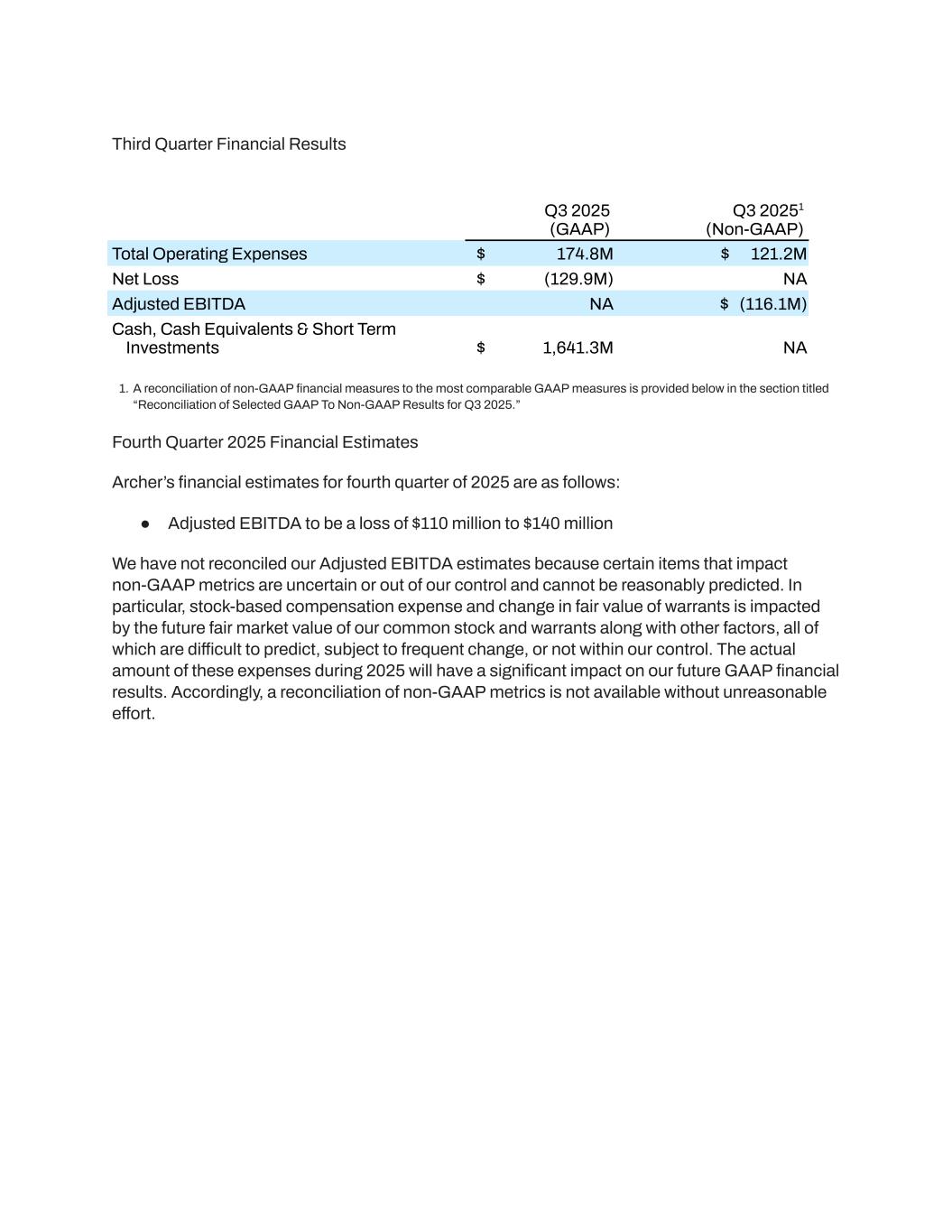 Third Quarter Financial Results ​ Q3 2025​ (GAAP) Q3 20251​ (Non-GAAP) Total Operating Expenses $ 174.8M $ 121.2M Net Loss $ (129.9M) NA Adjusted EBITDA NA $ (116.1M) Cash, Cash Equivalents & Short Term Investments $ 1,641.3M NA 1.​A reconciliation of non-GAAP financial measures to the most comparable GAAP measures is provided below in the section titled “Reconciliation of Selected GAAP To Non-GAAP Results for Q3 2025.” Fourth Quarter 2025 Financial Estimates Archer’s financial estimates for fourth quarter of 2025 are as follows: ●​ Adjusted EBITDA to be a loss of $110 million to $140 million We have not reconciled our Adjusted EBITDA estimates because certain items that impact non-GAAP metrics are uncertain or out of our control and cannot be reasonably predicted. In particular, stock-based compensation expense and change in fair value of warrants is impacted by the future fair market value of our common stock and warrants along with other factors, all of which are difficult to predict, subject to frequent change, or not within our control. The actual amount of these expenses during 2025 will have a significant impact on our future GAAP financial results. Accordingly, a reconciliation of non-GAAP metrics is not available without unreasonable effort.
