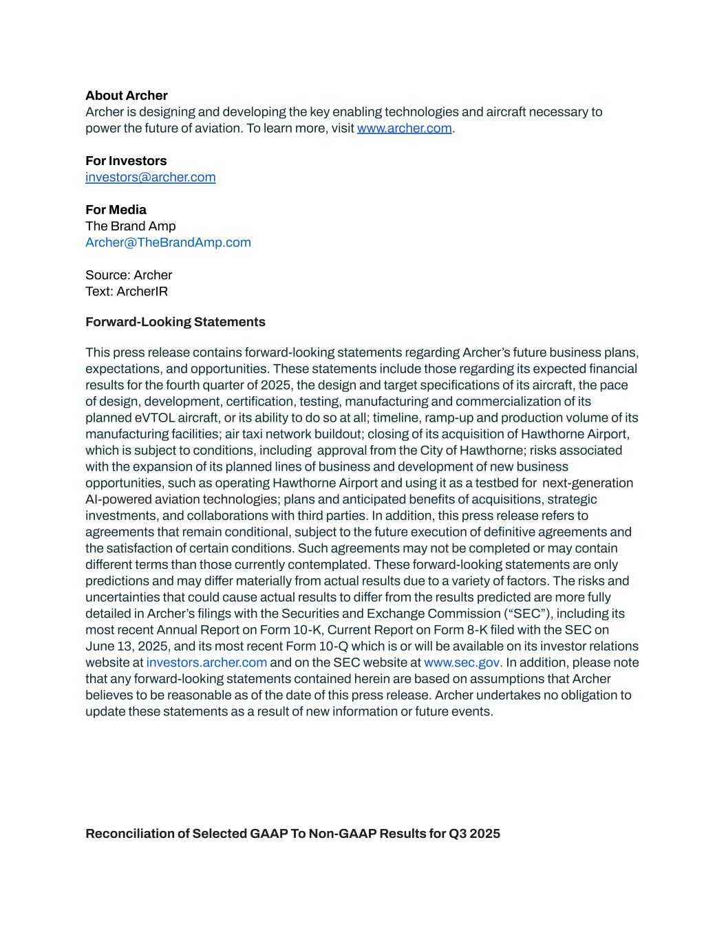 About Archer Archer is designing and developing the key enabling technologies and aircraft necessary to power the future of aviation. To learn more, visit www.archer.com. For Investors investors@archer.com For Media The Brand Amp Archer@TheBrandAmp.com Source: Archer Text: ArcherIR Forward-Looking Statements This press release contains forward-looking statements regarding Archer’s future business plans, expectations, and opportunities. These statements include those regarding its expected financial results for the fourth quarter of 2025, the design and target specifications of its aircraft, the pace of design, development, certification, testing, manufacturing and commercialization of its planned eVTOL aircraft, or its ability to do so at all; timeline, ramp-up and production volume of its manufacturing facilities; air taxi network buildout; closing of its acquisition of Hawthorne Airport, which is subject to conditions, including approval from the City of Hawthorne; risks associated with the expansion of its planned lines of business and development of new business opportunities, such as operating Hawthorne Airport and using it as a testbed for next-generation AI-powered aviation technologies; plans and anticipated benefits of acquisitions, strategic investments, and collaborations with third parties. In addition, this press release refers to agreements that remain conditional, subject to the future execution of definitive agreements and the satisfaction of certain conditions. Such agreements may not be completed or may contain different terms than those currently contemplated. These forward-looking statements are only predictions and may differ materially from actual results due to a variety of factors. The risks and uncertainties that could cause actual results to differ from the results predicted are more fully detailed in Archer’s filings with the Securities and Exchange Commission (“SEC”), including its most recent Annual Report on Form 10-K, Current Report on Form 8-K filed with the SEC on June 13, 2025, and its most recent Form 10-Q which is or will be available on its investor relations website at investors.archer.com and on the SEC website at www.sec.gov. In addition, please note that any forward-looking statements contained herein are based on assumptions that Archer believes to be reasonable as of the date of this press release. Archer undertakes no obligation to update these statements as a result of new information or future events. Reconciliation of Selected GAAP To Non-GAAP Results for Q3 2025