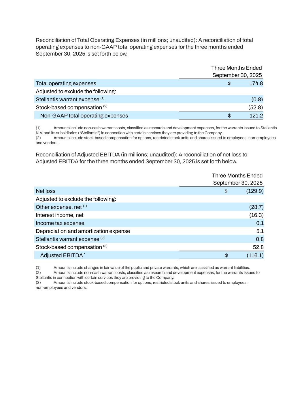 Reconciliation of Total Operating Expenses (in millions; unaudited): A reconciliation of total operating expenses to non-GAAP total operating expenses for the three months ended September 30, 2025 is set forth below. Three Months Ended September 30, 2025 Total operating expenses $​ 174.8 Adjusted to exclude the following: Stellantis warrant expense (1) (0.8) Stock-based compensation (2) (52.8) Non-GAAP total operating expenses $ ​ 121.2 (1)​ Amounts include non-cash warrant costs, classified as research and development expenses, for the warrants issued to Stellantis N.V. and its subsidiaries (“Stellantis”) in connection with certain services they are providing to the Company. (2)​ Amounts include stock-based compensation for options, restricted stock units and shares issued to employees, non-employees and vendors. Reconciliation of Adjusted EBITDA (in millions; unaudited): A reconciliation of net loss to Adjusted EBITDA for the three months ended September 30, 2025 is set forth below. Three Months Ended September 30, 2025 Net loss $​ (129.9) Adjusted to exclude the following: Other expense, net (1) (28.7) Interest income, net (16.3) Income tax expense ​ 0.1 Depreciation and amortization expense ​ 5.1 Stellantis warrant expense (2) ​ 0.8 Stock-based compensation (3) ​ 52.8 Adjusted EBITDA ` $​ (116.1) (1)​ Amounts include changes in fair value of the public and private warrants, which are classified as warrant liabilities. (2)​ Amounts include non-cash warrant costs, classified as research and development expenses, for the warrants issued to Stellantis in connection with certain services they are providing to the Company. (3)​ Amounts include stock-based compensation for options, restricted stock units and shares issued to employees, non-employees and vendors.