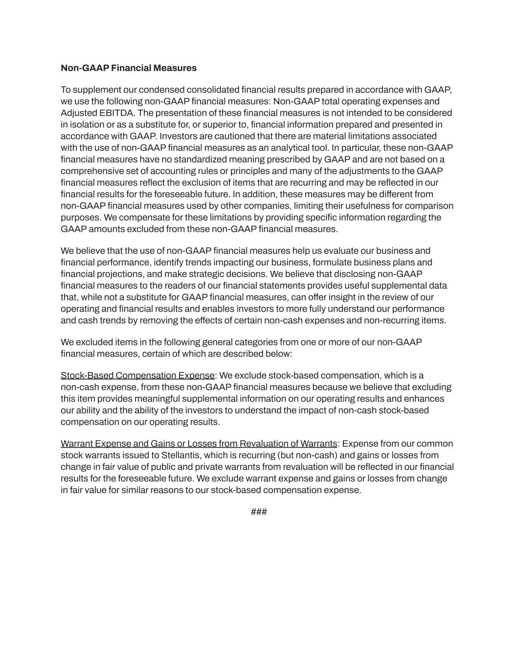 Non-GAAP Financial Measures To supplement our condensed consolidated financial results prepared in accordance with GAAP, we use the following non-GAAP financial measures: Non-GAAP total operating expenses and Adjusted EBITDA. The presentation of these financial measures is not intended to be considered in isolation or as a substitute for, or superior to, financial information prepared and presented in accordance with GAAP. Investors are cautioned that there are material limitations associated with the use of non-GAAP financial measures as an analytical tool. In particular, these non-GAAP financial measures have no standardized meaning prescribed by GAAP and are not based on a comprehensive set of accounting rules or principles and many of the adjustments to the GAAP financial measures reflect the exclusion of items that are recurring and may be reflected in our financial results for the foreseeable future. In addition, these measures may be different from non-GAAP financial measures used by other companies, limiting their usefulness for comparison purposes. We compensate for these limitations by providing specific information regarding the GAAP amounts excluded from these non-GAAP financial measures. We believe that the use of non-GAAP financial measures help us evaluate our business and financial performance, identify trends impacting our business, formulate business plans and financial projections, and make strategic decisions. We believe that disclosing non-GAAP financial measures to the readers of our financial statements provides useful supplemental data that, while not a substitute for GAAP financial measures, can offer insight in the review of our operating and financial results and enables investors to more fully understand our performance and cash trends by removing the effects of certain non-cash expenses and non-recurring items. We excluded items in the following general categories from one or more of our non-GAAP financial measures, certain of which are described below: Stock-Based Compensation Expense: We exclude stock-based compensation, which is a non-cash expense, from these non-GAAP financial measures because we believe that excluding this item provides meaningful supplemental information on our operating results and enhances our ability and the ability of the investors to understand the impact of non-cash stock-based compensation on our operating results. Warrant Expense and Gains or Losses from Revaluation of Warrants: Expense from our common stock warrants issued to Stellantis, which is recurring (but non-cash) and gains or losses from change in fair value of public and private warrants from revaluation will be reflected in our financial results for the foreseeable future. We exclude warrant expense and gains or losses from change in fair value for similar reasons to our stock-based compensation expense. ###