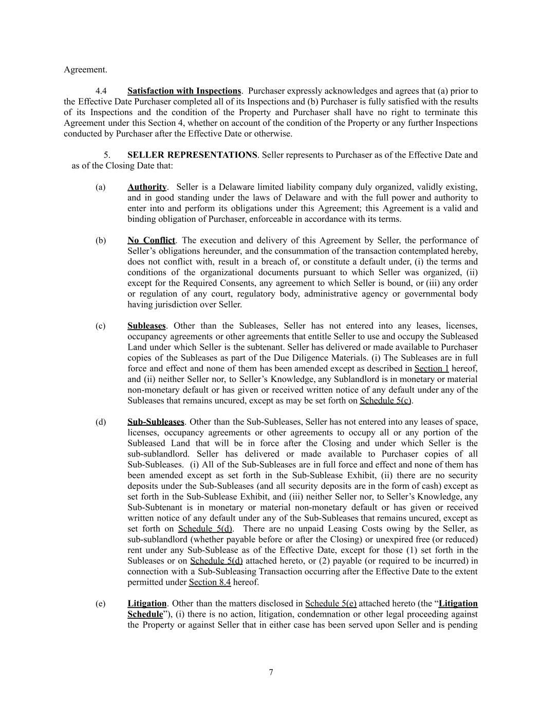 Agreement. 4.4​ Satisfaction with Inspections. Purchaser expressly acknowledges and agrees that (a) prior to the Effective Date Purchaser completed all of its Inspections and (b) Purchaser is fully satisfied with the results of its Inspections and the condition of the Property and Purchaser shall have no right to terminate this Agreement under this Section 4, whether on account of the condition of the Property or any further Inspections conducted by Purchaser after the Effective Date or otherwise. 5.​ SELLER REPRESENTATIONS. Seller represents to Purchaser as of the Effective Date and as of the Closing Date that: (a)​ Authority. Seller is a Delaware limited liability company duly organized, validly existing, and in good standing under the laws of Delaware and with the full power and authority to enter into and perform its obligations under this Agreement; this Agreement is a valid and binding obligation of Purchaser, enforceable in accordance with its terms. (b)​ No Conflict. The execution and delivery of this Agreement by Seller, the performance of Seller’s obligations hereunder, and the consummation of the transaction contemplated hereby, does not conflict with, result in a breach of, or constitute a default under, (i) the terms and conditions of the organizational documents pursuant to which Seller was organized, (ii) except for the Required Consents, any agreement to which Seller is bound, or (iii) any order or regulation of any court, regulatory body, administrative agency or governmental body having jurisdiction over Seller. (c)​ Subleases. Other than the Subleases, Seller has not entered into any leases, licenses, occupancy agreements or other agreements that entitle Seller to use and occupy the Subleased Land under which Seller is the subtenant. Seller has delivered or made available to Purchaser copies of the Subleases as part of the Due Diligence Materials. (i) The Subleases are in full force and effect and none of them has been amended except as described in Section 1 hereof, and (ii) neither Seller nor, to Seller’s Knowledge, any Sublandlord is in monetary or material non-monetary default or has given or received written notice of any default under any of the Subleases that remains uncured, except as may be set forth on Schedule 5(c). (d)​ Sub-Subleases. Other than the Sub-Subleases, Seller has not entered into any leases of space, licenses, occupancy agreements or other agreements to occupy all or any portion of the Subleased Land that will be in force after the Closing and under which Seller is the sub-sublandlord. Seller has delivered or made available to Purchaser copies of all Sub-Subleases. (i) All of the Sub-Subleases are in full force and effect and none of them has been amended except as set forth in the Sub-Sublease Exhibit, (ii) there are no security deposits under the Sub-Subleases (and all security deposits are in the form of cash) except as set forth in the Sub-Sublease Exhibit, and (iii) neither Seller nor, to Seller’s Knowledge, any Sub-Subtenant is in monetary or material non-monetary default or has given or received written notice of any default under any of the Sub-Subleases that remains uncured, except as set forth on Schedule 5(d). There are no unpaid Leasing Costs owing by the Seller, as sub-sublandlord (whether payable before or after the Closing) or unexpired free (or reduced) rent under any Sub-Sublease as of the Effective Date, except for those (1) set forth in the Subleases or on Schedule 5(d) attached hereto, or (2) payable (or required to be incurred) in connection with a Sub-Subleasing Transaction occurring after the Effective Date to the extent permitted under Section 8.4 hereof. (e)​ Litigation. Other than the matters disclosed in Schedule 5(e) attached hereto (the “Litigation Schedule”), (i) there is no action, litigation, condemnation or other legal proceeding against the Property or against Seller that in either case has been served upon Seller and is pending 7