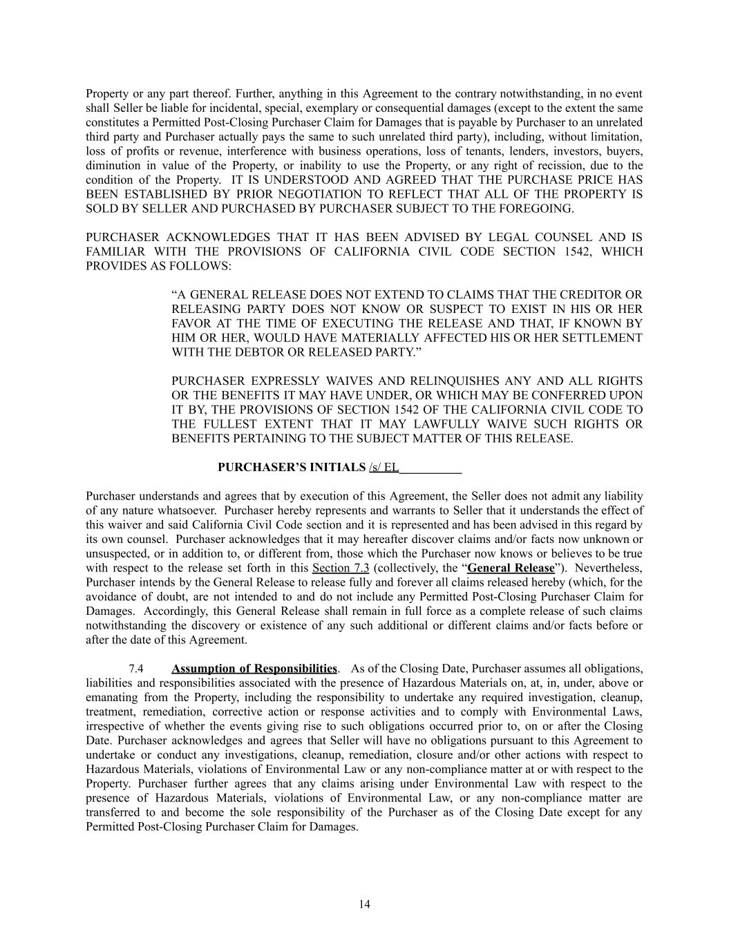 Property or any part thereof. Further, anything in this Agreement to the contrary notwithstanding, in no event shall Seller be liable for incidental, special, exemplary or consequential damages (except to the extent the same constitutes a Permitted Post-Closing Purchaser Claim for Damages that is payable by Purchaser to an unrelated third party and Purchaser actually pays the same to such unrelated third party), including, without limitation, loss of profits or revenue, interference with business operations, loss of tenants, lenders, investors, buyers, diminution in value of the Property, or inability to use the Property, or any right of recission, due to the condition of the Property. IT IS UNDERSTOOD AND AGREED THAT THE PURCHASE PRICE HAS BEEN ESTABLISHED BY PRIOR NEGOTIATION TO REFLECT THAT ALL OF THE PROPERTY IS SOLD BY SELLER AND PURCHASED BY PURCHASER SUBJECT TO THE FOREGOING. PURCHASER ACKNOWLEDGES THAT IT HAS BEEN ADVISED BY LEGAL COUNSEL AND IS FAMILIAR WITH THE PROVISIONS OF CALIFORNIA CIVIL CODE SECTION 1542, WHICH PROVIDES AS FOLLOWS: “A GENERAL RELEASE DOES NOT EXTEND TO CLAIMS THAT THE CREDITOR OR RELEASING PARTY DOES NOT KNOW OR SUSPECT TO EXIST IN HIS OR HER FAVOR AT THE TIME OF EXECUTING THE RELEASE AND THAT, IF KNOWN BY HIM OR HER, WOULD HAVE MATERIALLY AFFECTED HIS OR HER SETTLEMENT WITH THE DEBTOR OR RELEASED PARTY.” PURCHASER EXPRESSLY WAIVES AND RELINQUISHES ANY AND ALL RIGHTS OR THE BENEFITS IT MAY HAVE UNDER, OR WHICH MAY BE CONFERRED UPON IT BY, THE PROVISIONS OF SECTION 1542 OF THE CALIFORNIA CIVIL CODE TO THE FULLEST EXTENT THAT IT MAY LAWFULLY WAIVE SUCH RIGHTS OR BENEFITS PERTAINING TO THE SUBJECT MATTER OF THIS RELEASE.                                                                 PURCHASER’S INITIALS /s/ EL__________ Purchaser understands and agrees that by execution of this Agreement, the Seller does not admit any liability of any nature whatsoever.  Purchaser hereby represents and warrants to Seller that it understands the effect of this waiver and said California Civil Code section and it is represented and has been advised in this regard by its own counsel.  Purchaser acknowledges that it may hereafter discover claims and/or facts now unknown or unsuspected, or in addition to, or different from, those which the Purchaser now knows or believes to be true with respect to the release set forth in this Section 7.3 (collectively, the “General Release”).  Nevertheless, Purchaser intends by the General Release to release fully and forever all claims released hereby (which, for the avoidance of doubt, are not intended to and do not include any Permitted Post-Closing Purchaser Claim for Damages.  Accordingly, this General Release shall remain in full force as a complete release of such claims notwithstanding the discovery or existence of any such additional or different claims and/or facts before or after the date of this Agreement.                    7.4​ Assumption of Responsibilities. As of the Closing Date, Purchaser assumes all obligations, liabilities and responsibilities associated with the presence of Hazardous Materials on, at, in, under, above or emanating from the Property, including the responsibility to undertake any required investigation, cleanup, treatment, remediation, corrective action or response activities and to comply with Environmental Laws, irrespective of whether the events giving rise to such obligations occurred prior to, on or after the Closing Date. Purchaser acknowledges and agrees that Seller will have no obligations pursuant to this Agreement to undertake or conduct any investigations, cleanup, remediation, closure and/or other actions with respect to Hazardous Materials, violations of Environmental Law or any non-compliance matter at or with respect to the Property. Purchaser further agrees that any claims arising under Environmental Law with respect to the presence of Hazardous Materials, violations of Environmental Law, or any non-compliance matter are transferred to and become the sole responsibility of the Purchaser as of the Closing Date except for any Permitted Post-Closing Purchaser Claim for Damages. 14