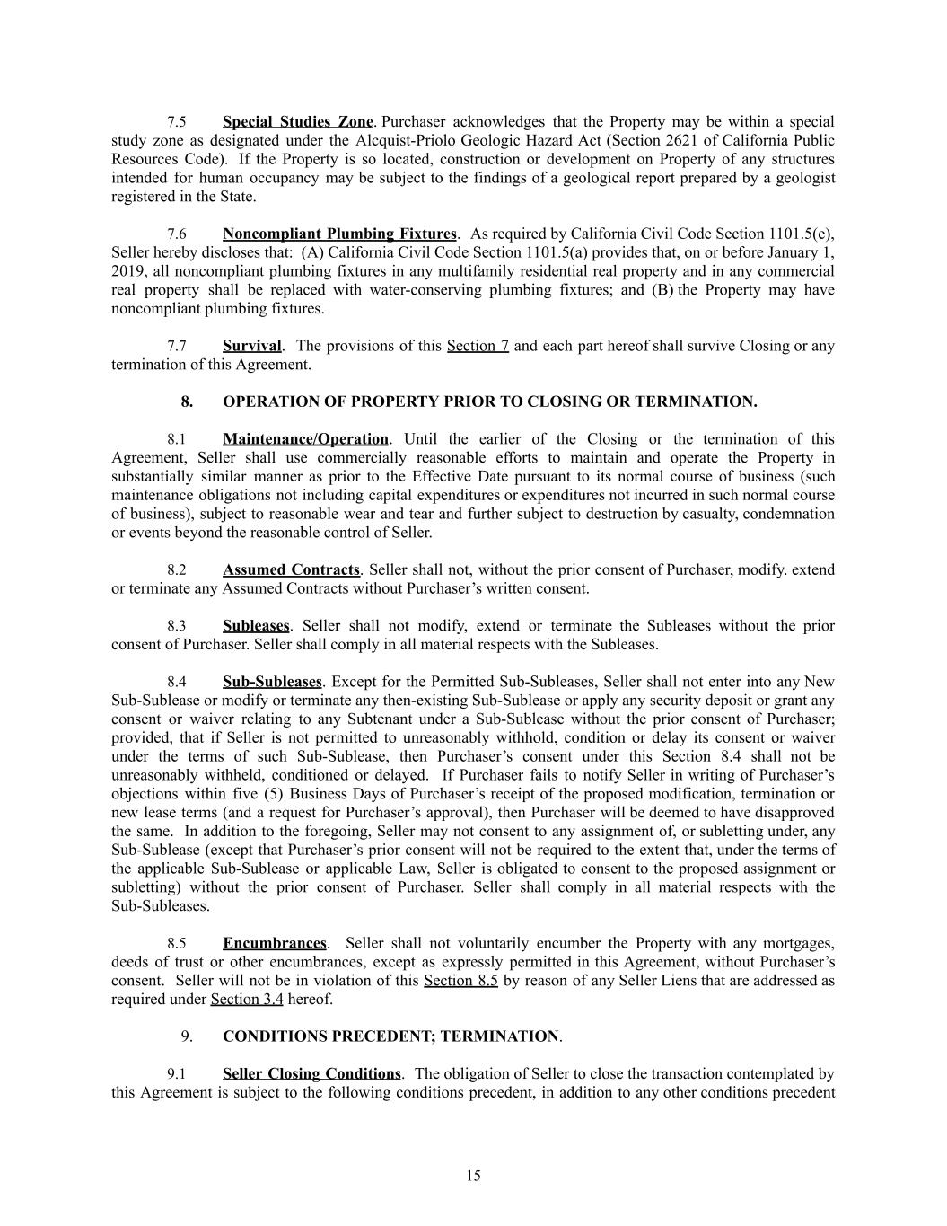 7.5​ Special Studies Zone. Purchaser acknowledges that the Property may be within a special study zone as designated under the Alcquist-Priolo Geologic Hazard Act (Section 2621 of California Public Resources Code).  If the Property is so located, construction or development on Property of any structures intended for human occupancy may be subject to the findings of a geological report prepared by a geologist registered in the State. 7.6​ Noncompliant Plumbing Fixtures.  As required by California Civil Code Section 1101.5(e), Seller hereby discloses that:  (A) California Civil Code Section 1101.5(a) provides that, on or before January 1, 2019, all noncompliant plumbing fixtures in any multifamily residential real property and in any commercial real property shall be replaced with water-conserving plumbing fixtures; and (B) the Property may have noncompliant plumbing fixtures. 7.7​ Survival. The provisions of this Section 7 and each part hereof shall survive Closing or any termination of this Agreement. 8.​ OPERATION OF PROPERTY PRIOR TO CLOSING OR TERMINATION. 8.1​ Maintenance/Operation. Until the earlier of the Closing or the termination of this Agreement, Seller shall use commercially reasonable efforts to maintain and operate the Property in substantially similar manner as prior to the Effective Date pursuant to its normal course of business (such maintenance obligations not including capital expenditures or expenditures not incurred in such normal course of business), subject to reasonable wear and tear and further subject to destruction by casualty, condemnation or events beyond the reasonable control of Seller. 8.2​ Assumed Contracts. Seller shall not, without the prior consent of Purchaser, modify. extend or terminate any Assumed Contracts without Purchaser’s written consent. 8.3​ Subleases. Seller shall not modify, extend or terminate the Subleases without the prior consent of Purchaser. Seller shall comply in all material respects with the Subleases. 8.4​ Sub-Subleases. Except for the Permitted Sub-Subleases, Seller shall not enter into any New Sub-Sublease or modify or terminate any then-existing Sub-Sublease or apply any security deposit or grant any consent or waiver relating to any Subtenant under a Sub-Sublease without the prior consent of Purchaser; provided, that if Seller is not permitted to unreasonably withhold, condition or delay its consent or waiver under the terms of such Sub-Sublease, then Purchaser’s consent under this Section 8.4 shall not be unreasonably withheld, conditioned or delayed. If Purchaser fails to notify Seller in writing of Purchaser’s objections within five (5) Business Days of Purchaser’s receipt of the proposed modification, termination or new lease terms (and a request for Purchaser’s approval), then Purchaser will be deemed to have disapproved the same. In addition to the foregoing, Seller may not consent to any assignment of, or subletting under, any Sub-Sublease (except that Purchaser’s prior consent will not be required to the extent that, under the terms of the applicable Sub-Sublease or applicable Law, Seller is obligated to consent to the proposed assignment or subletting) without the prior consent of Purchaser. Seller shall comply in all material respects with the Sub-Subleases. 8.5​ Encumbrances. Seller shall not voluntarily encumber the Property with any mortgages, deeds of trust or other encumbrances, except as expressly permitted in this Agreement, without Purchaser’s consent. Seller will not be in violation of this Section 8.5 by reason of any Seller Liens that are addressed as required under Section 3.4 hereof. 9.​ CONDITIONS PRECEDENT; TERMINATION. 9.1​ Seller Closing Conditions. The obligation of Seller to close the transaction contemplated by this Agreement is subject to the following conditions precedent, in addition to any other conditions precedent 15