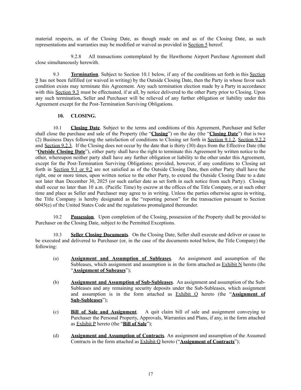 material respects, as of the Closing Date, as though made on and as of the Closing Date, as such representations and warranties may be modified or waived as provided in Section 5 hereof. 9.2.8​ All transactions contemplated by the Hawthorne Airport Purchase Agreement shall close simultaneously herewith. 9.3​ Termination. Subject to Section 10.1 below, if any of the conditions set forth in this Section 9 has not been fulfilled (or waived in writing) by the Outside Closing Date, then the Party in whose favor such condition exists may terminate this Agreement. Any such termination election made by a Party in accordance with this Section 9.3 must be effectuated, if at all, by notice delivered to the other Party prior to Closing. Upon any such termination, Seller and Purchaser will be relieved of any further obligation or liability under this Agreement except for the Post-Termination Surviving Obligations. 10.​ CLOSING. 10.1​ Closing Date. Subject to the terms and conditions of this Agreement, Purchaser and Seller shall close the purchase and sale of the Property (the “Closing”) on the day (the “Closing Date”) that is two (2) Business Days following the satisfaction of conditions to Closing set forth in Section 9.1.2, Section 9.2.2 and Section 9.2.3. If the Closing does not occur by the date that is thirty (30) days from the Effective Date (the “Outside Closing Date”), either party shall have the right to terminate this Agreement by written notice to the other, whereupon neither party shall have any further obligation or liability to the other under this Agreement, except for the Post-Termination Surviving Obligations; provided, however, if any conditions to Closing set forth in Section 9.1 or 9.2 are not satisfied as of the Outside Closing Date, then either Party shall have the right, one or more times, upon written notice to the other Party, to extend the Outside Closing Date to a date not later than December 30, 2025 (or such earlier date as set forth in such notice from such Party). Closing shall occur no later than 10 a.m. (Pacific Time) by escrow at the offices of the Title Company, or at such other time and place as Seller and Purchaser may agree to in writing. Unless the parties otherwise agree in writing, the Title Company is hereby designated as the “reporting person” for the transaction pursuant to Section 6045(e) of the United States Code and the regulations promulgated thereunder. 10.2​ Possession. Upon completion of the Closing, possession of the Property shall be provided to Purchaser on the Closing Date, subject to the Permitted Exceptions. 10.3​ Seller Closing Documents. On the Closing Date, Seller shall execute and deliver or cause to be executed and delivered to Purchaser (or, in the case of the documents noted below, the Title Company) the following: (a)​ Assignment and Assumption of Subleases. An assignment and assumption of the Subleases, which assignment and assumption is in the form attached as Exhibit N hereto (the “Assignment of Subeases”); (b)​ Assignment and Assumption of Sub-Subleases. An assignment and assumption of the Sub- Subleases and any remaining security deposits under the Sub-Subleases, which assignment and assumption is in the form attached as Exhibit O hereto (the “Assignment of Sub-Subleases”); (c)​ Bill of Sale and Assignment. A quit claim bill of sale and assignment conveying to Purchaser the Personal Property, Approvals, Warranties and Plans, if any, in the form attached as Exhibit P hereto (the “Bill of Sale”); (d)​ Assignment and Assumption of Contracts. An assignment and assumption of the Assumed Contracts in the form attached as Exhibit Q hereto (“Assignment of Contracts”); 17