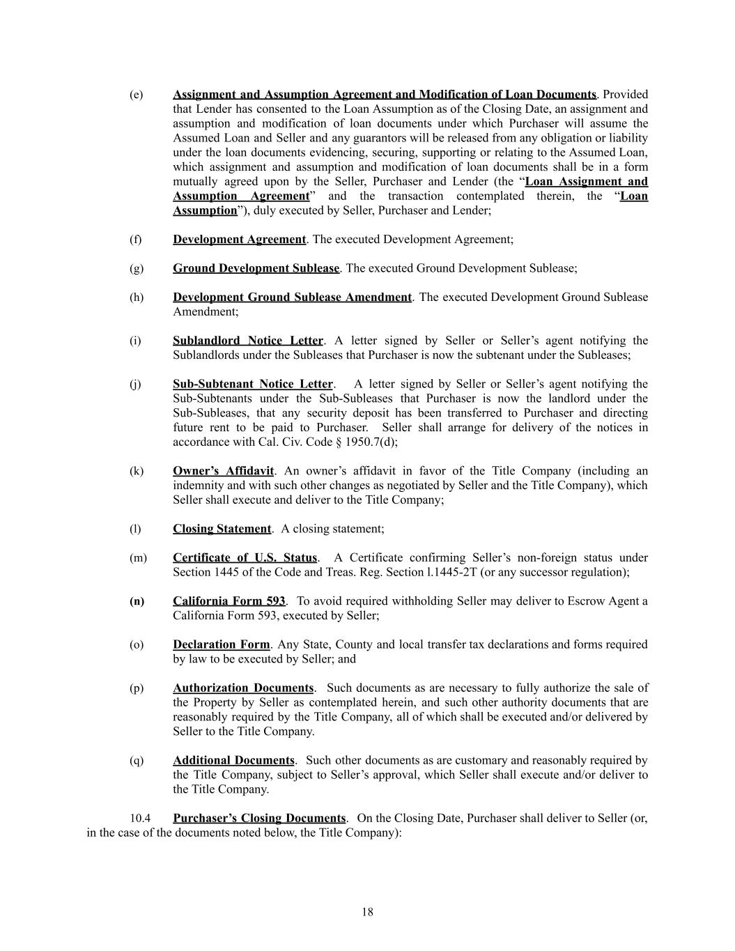 (e)​ Assignment and Assumption Agreement and Modification of Loan Documents. Provided that Lender has consented to the Loan Assumption as of the Closing Date, an assignment and assumption and modification of loan documents under which Purchaser will assume the Assumed Loan and Seller and any guarantors will be released from any obligation or liability under the loan documents evidencing, securing, supporting or relating to the Assumed Loan, which assignment and assumption and modification of loan documents shall be in a form mutually agreed upon by the Seller, Purchaser and Lender (the “Loan Assignment and Assumption Agreement” and the transaction contemplated therein, the “Loan Assumption”), duly executed by Seller, Purchaser and Lender; (f)​ Development Agreement. The executed Development Agreement; (g)​ Ground Development Sublease. The executed Ground Development Sublease; (h)​ Development Ground Sublease Amendment. The executed Development Ground Sublease Amendment; (i)​ Sublandlord Notice Letter. A letter signed by Seller or Seller’s agent notifying the Sublandlords under the Subleases that Purchaser is now the subtenant under the Subleases; (j)​ Sub-Subtenant Notice Letter. A letter signed by Seller or Seller’s agent notifying the Sub-Subtenants under the Sub-Subleases that Purchaser is now the landlord under the Sub-Subleases, that any security deposit has been transferred to Purchaser and directing future rent to be paid to Purchaser. Seller shall arrange for delivery of the notices in accordance with Cal. Civ. Code § 1950.7(d); (k)​ Owner’s Affidavit. An owner’s affidavit in favor of the Title Company (including an indemnity and with such other changes as negotiated by Seller and the Title Company), which Seller shall execute and deliver to the Title Company; (l)​ Closing Statement. A closing statement; (m)​ Certificate of U.S. Status. A Certificate confirming Seller’s non-foreign status under Section 1445 of the Code and Treas. Reg. Section l.1445-2T (or any successor regulation); (n)​ California Form 593. To avoid required withholding Seller may deliver to Escrow Agent a California Form 593, executed by Seller; (o)​ Declaration Form. Any State, County and local transfer tax declarations and forms required by law to be executed by Seller; and (p)​ Authorization Documents. Such documents as are necessary to fully authorize the sale of the Property by Seller as contemplated herein, and such other authority documents that are reasonably required by the Title Company, all of which shall be executed and/or delivered by Seller to the Title Company. (q)​ Additional Documents. Such other documents as are customary and reasonably required by the Title Company, subject to Seller’s approval, which Seller shall execute and/or deliver to the Title Company. 10.4​ Purchaser’s Closing Documents. On the Closing Date, Purchaser shall deliver to Seller (or, in the case of the documents noted below, the Title Company): 18