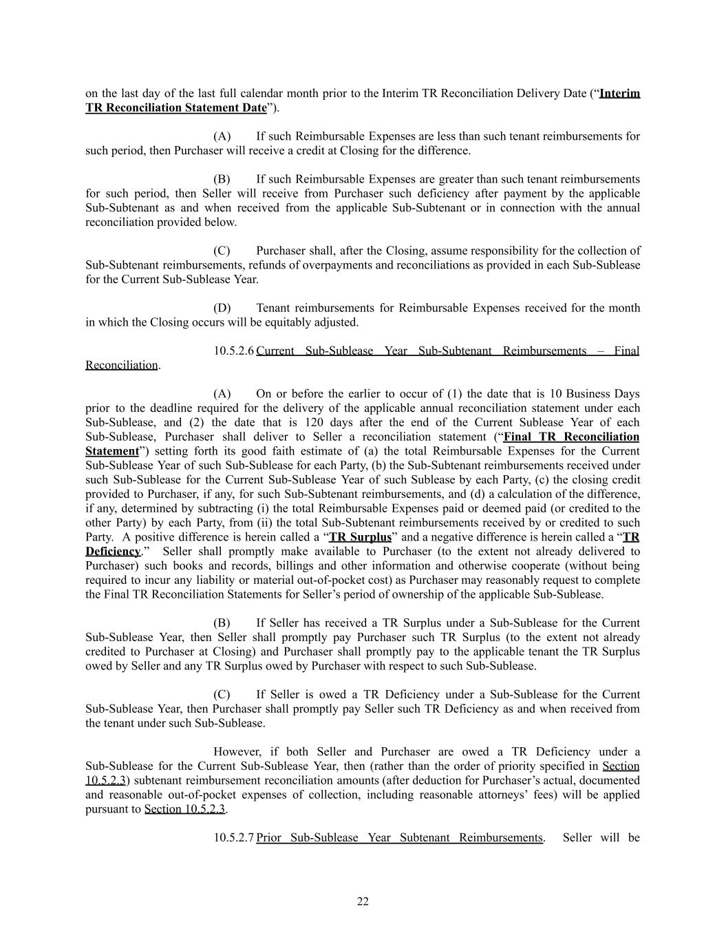 on the last day of the last full calendar month prior to the Interim TR Reconciliation Delivery Date (“Interim TR Reconciliation Statement Date”). (A)​ If such Reimbursable Expenses are less than such tenant reimbursements for such period, then Purchaser will receive a credit at Closing for the difference. (B)​ If such Reimbursable Expenses are greater than such tenant reimbursements for such period, then Seller will receive from Purchaser such deficiency after payment by the applicable Sub-Subtenant as and when received from the applicable Sub-Subtenant or in connection with the annual reconciliation provided below. (C)​ Purchaser shall, after the Closing, assume responsibility for the collection of Sub-Subtenant reimbursements, refunds of overpayments and reconciliations as provided in each Sub-Sublease for the Current Sub-Sublease Year. (D)​ Tenant reimbursements for Reimbursable Expenses received for the month in which the Closing occurs will be equitably adjusted. 10.5.2.6​Current Sub-Sublease Year Sub-Subtenant Reimbursements – Final Reconciliation. (A)​ On or before the earlier to occur of (1) the date that is 10 Business Days prior to the deadline required for the delivery of the applicable annual reconciliation statement under each Sub-Sublease, and (2) the date that is 120 days after the end of the Current Sublease Year of each Sub-Sublease, Purchaser shall deliver to Seller a reconciliation statement (“Final TR Reconciliation Statement”) setting forth its good faith estimate of (a) the total Reimbursable Expenses for the Current Sub-Sublease Year of such Sub-Sublease for each Party, (b) the Sub-Subtenant reimbursements received under such Sub-Sublease for the Current Sub-Sublease Year of such Sublease by each Party, (c) the closing credit provided to Purchaser, if any, for such Sub-Subtenant reimbursements, and (d) a calculation of the difference, if any, determined by subtracting (i) the total Reimbursable Expenses paid or deemed paid (or credited to the other Party) by each Party, from (ii) the total Sub-Subtenant reimbursements received by or credited to such Party. A positive difference is herein called a “TR Surplus” and a negative difference is herein called a “TR Deficiency.” Seller shall promptly make available to Purchaser (to the extent not already delivered to Purchaser) such books and records, billings and other information and otherwise cooperate (without being required to incur any liability or material out-of-pocket cost) as Purchaser may reasonably request to complete the Final TR Reconciliation Statements for Seller’s period of ownership of the applicable Sub-Sublease. (B)​ If Seller has received a TR Surplus under a Sub-Sublease for the Current Sub-Sublease Year, then Seller shall promptly pay Purchaser such TR Surplus (to the extent not already credited to Purchaser at Closing) and Purchaser shall promptly pay to the applicable tenant the TR Surplus owed by Seller and any TR Surplus owed by Purchaser with respect to such Sub-Sublease. (C)​ If Seller is owed a TR Deficiency under a Sub-Sublease for the Current Sub-Sublease Year, then Purchaser shall promptly pay Seller such TR Deficiency as and when received from the tenant under such Sub-Sublease. However, if both Seller and Purchaser are owed a TR Deficiency under a Sub-Sublease for the Current Sub-Sublease Year, then (rather than the order of priority specified in Section 10.5.2.3) subtenant reimbursement reconciliation amounts (after deduction for Purchaser’s actual, documented and reasonable out-of-pocket expenses of collection, including reasonable attorneys’ fees) will be applied pursuant to Section 10.5.2.3. 10.5.2.7​Prior Sub-Sublease Year Subtenant Reimbursements. Seller will be 22