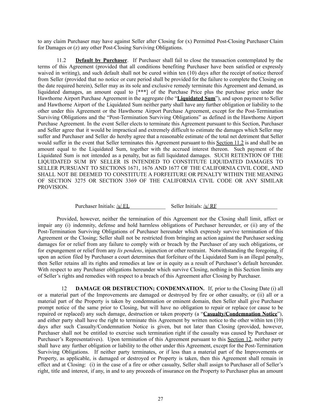 to any claim Purchaser may have against Seller after Closing for (x) Permitted Post-Closing Purchaser Claim for Damages or (z) any other Post-Closing Surviving Obligations. 11.2​ Default by Purchaser. If Purchaser shall fail to close the transaction contemplated by the terms of this Agreement (provided that all conditions benefiting Purchaser have been satisfied or expressly waived in writing), and such default shall not be cured within ten (10) days after the receipt of notice thereof from Seller (provided that no notice or cure period shall be provided for the failure to complete the Closing on the date required herein), Seller may as its sole and exclusive remedy terminate this Agreement and demand, as liquidated damages, an amount equal to [***] of the Purchase Price plus the purchase price under the Hawthorne Airport Purchase Agreement in the aggregate (the “Liquidated Sum”), and upon payment to Seller and Hawthorne Airport of the Liquidated Sum neither party shall have any further obligation or liability to the other under this Agreement or the Hawthorne Airport Purchase Agreement, except for the Post-Termination Surviving Obligations and the “Post-Termination Surviving Obligations” as defined in the Hawthorne Airport Purchase Agreement. In the event Seller elects to terminate this Agreement pursuant to this Section, Purchaser and Seller agree that it would be impractical and extremely difficult to estimate the damages which Seller may suffer and Purchaser and Seller do hereby agree that a reasonable estimate of the total net detriment that Seller would suffer in the event that Seller terminates this Agreement pursuant to this Section 11.2 is and shall be an amount equal to the Liquidated Sum, together with the accrued interest thereon. Such payment of the Liquidated Sum is not intended as a penalty, but as full liquidated damages. SUCH RETENTION OF THE LIQUIDATED SUM BY SELLER IS INTENDED TO CONSTITUTE LIQUIDATED DAMAGES TO SELLER PURSUANT TO SECTIONS 1671, 1676 AND 1677 OF THE CALIFORNIA CIVIL CODE, AND SHALL NOT BE DEEMED TO CONSTITUTE A FORFEITURE OR PENALTY WITHIN THE MEANING OF SECTION 3275 OR SECTION 3369 OF THE CALIFORNIA CIVIL CODE OR ANY SIMILAR PROVISION. Purchaser Initials: /s/ EL_____________ Seller Initials: /s/ RF______________________ Provided, however, neither the termination of this Agreement nor the Closing shall limit, affect or impair any (i) indemnity, defense and hold harmless obligations of Purchaser hereunder, or (ii) any of the Post-Termination Surviving Obligations of Purchaser hereunder which expressly survive termination of this Agreement or the Closing; Seller shall not be restricted from bringing an action against the Purchaser seeking damages for or relief from any failure to comply with or breach by the Purchaser of any such obligations, or for expungement or relief from any lis pendens, injunction or other restraint. Notwithstanding the foregoing, if upon an action filed by Purchaser a court determines that forfeiture of the Liquidated Sum is an illegal penalty, then Seller retains all its rights and remedies at law or in equity as a result of Purchaser’s default hereunder. With respect to any Purchaser obligations hereunder which survive Closing, nothing in this Section limits any of Seller’s rights and remedies with respect to a breach of this Agreement after Closing by Purchaser. 12​ DAMAGE OR DESTRUCTION; CONDEMNATION. If, prior to the Closing Date (i) all or a material part of the Improvements are damaged or destroyed by fire or other casualty, or (ii) all or a material part of the Property is taken by condemnation or eminent domain, then Seller shall give Purchaser prompt notice of the same prior to Closing, but will have no obligation to repair or replace (or cause to be repaired or replaced) any such damage, destruction or taken property (a “Casualty/Condemnation Notice”), and either party shall have the right to terminate this Agreement by written notice to the other within ten (10) days after such Casualty/Condemnation Notice is given, but not later than Closing (provided, however, Purchaser shall not be entitled to exercise such termination right if the casualty was caused by Purchaser or Purchaser’s Representatives). Upon termination of this Agreement pursuant to this Section 12, neither party shall have any further obligation or liability to the other under this Agreement, except for the Post-Termination Surviving Obligations. If neither party terminates, or if less than a material part of the Improvements or Property, as applicable, is damaged or destroyed or Property is taken, then this Agreement shall remain in effect and at Closing: (i) in the case of a fire or other casualty, Seller shall assign to Purchaser all of Seller’s right, title and interest, if any, in and to any proceeds of insurance on the Property to Purchaser plus an amount 27